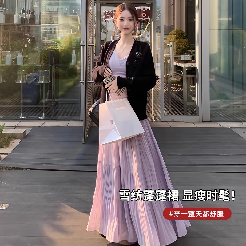 紫色半身裙女夏季薄款2025新款高腰a字蛋糕裙垂坠感中长款压褶裙