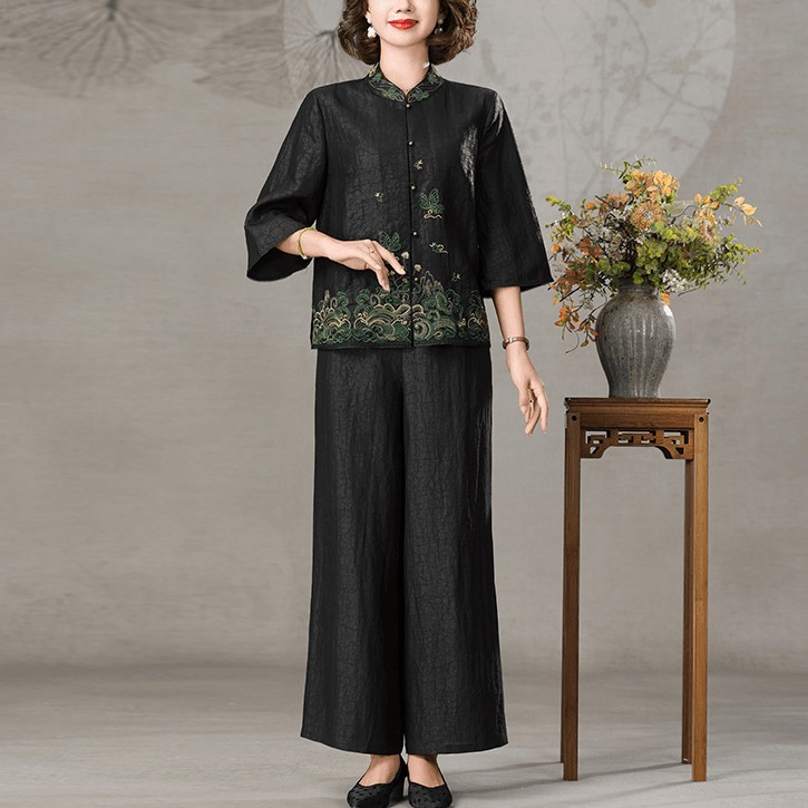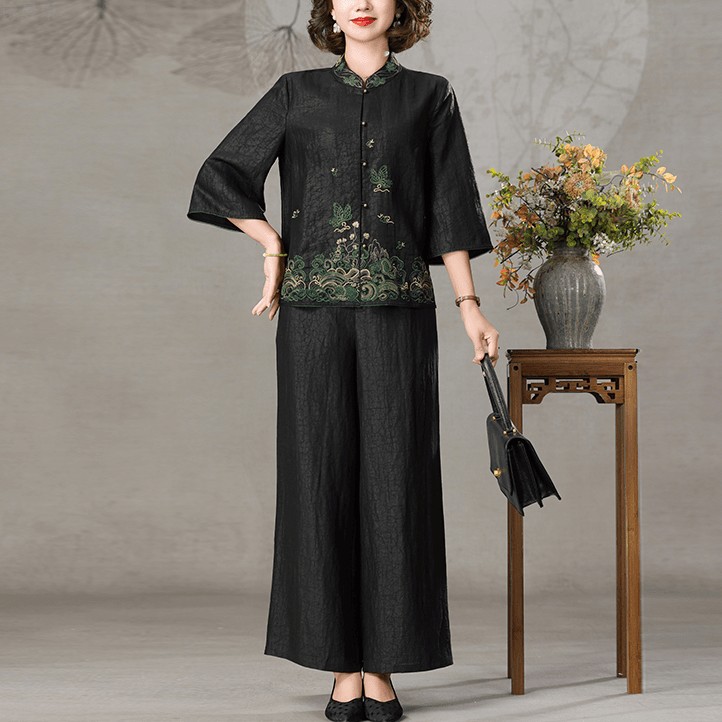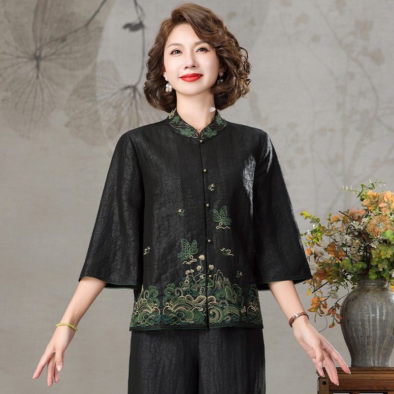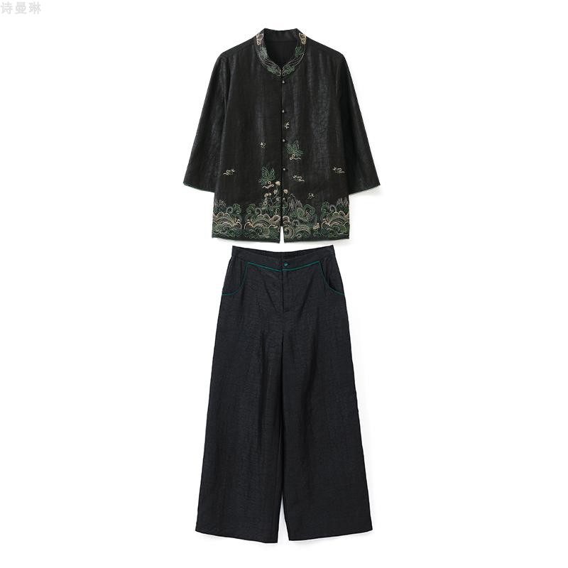 真丝套装新中式国风重工刺绣龟裂纹香云纱上衣秋新款妈妈装两件套