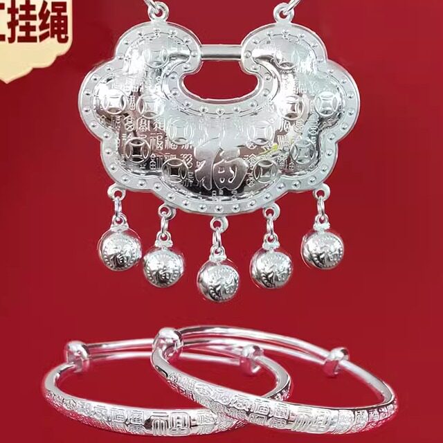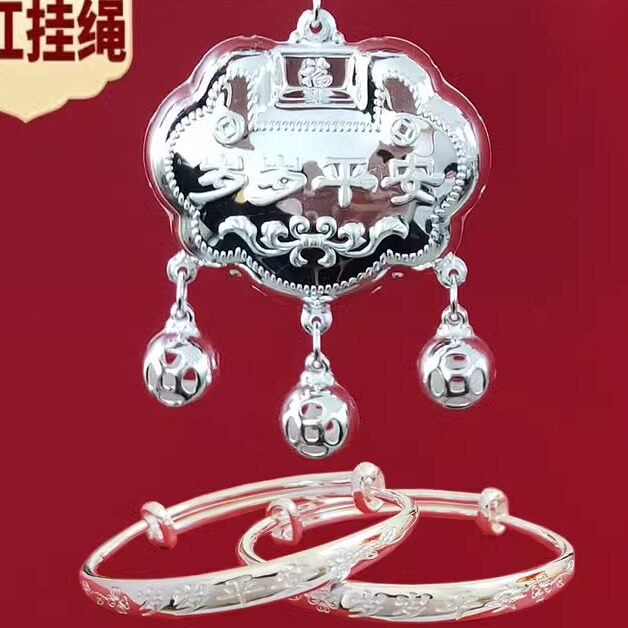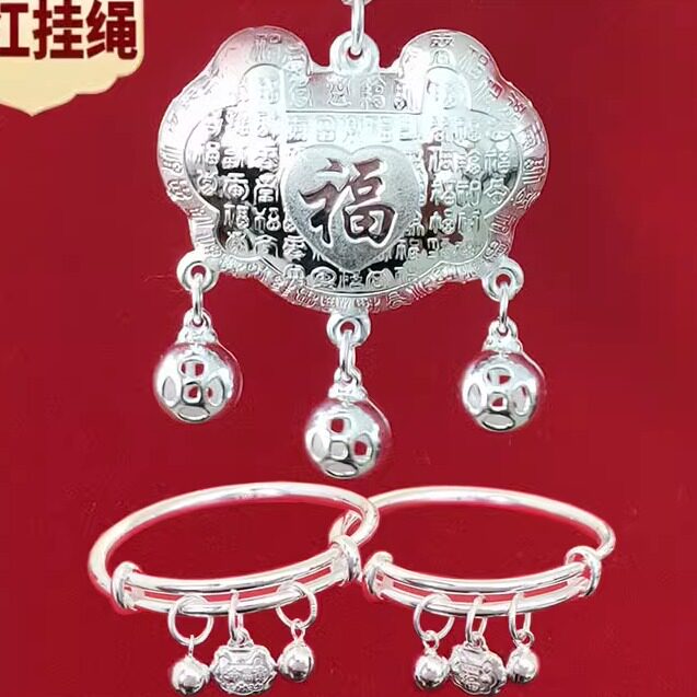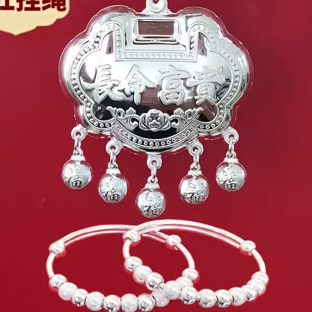 足银999宝宝银手镯子蛇龙年宝纯银长命锁婴儿童小孩满月套装礼盒