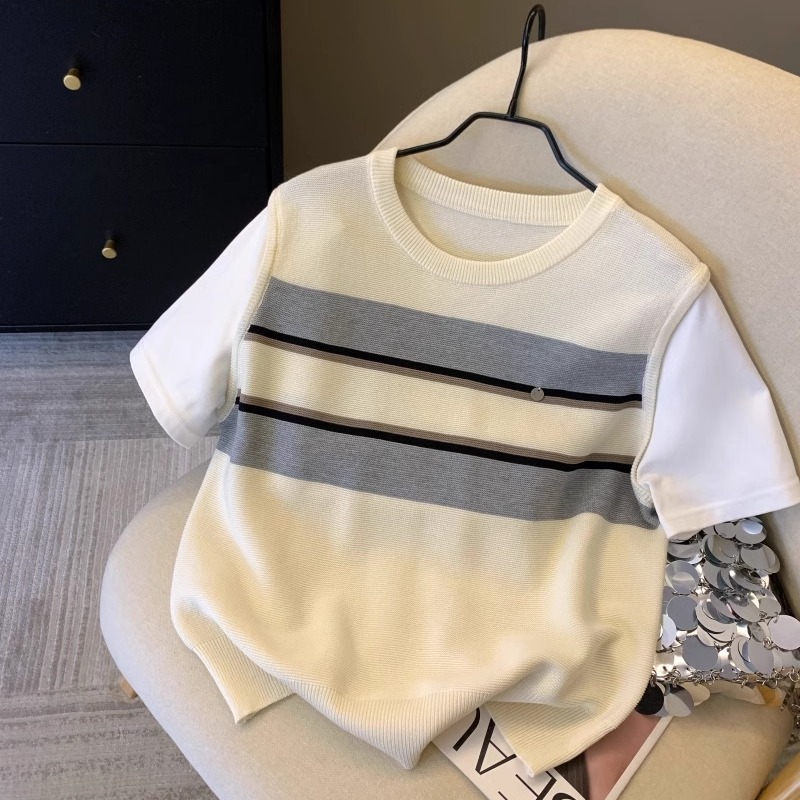 宽松显瘦【80-200斤】假两件撞色圆领短袖T恤女夏季洋气减龄上衣