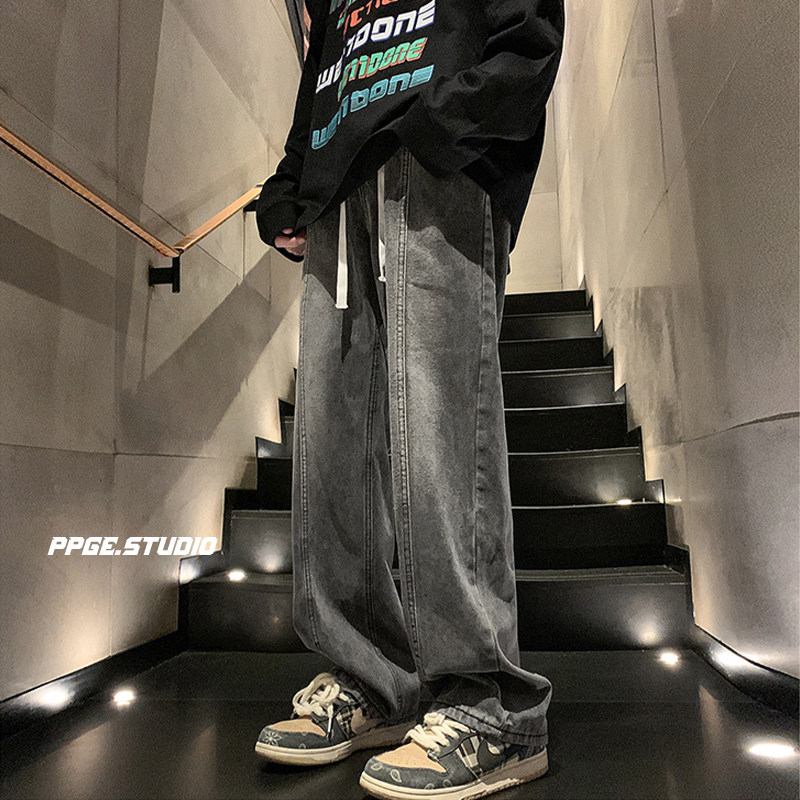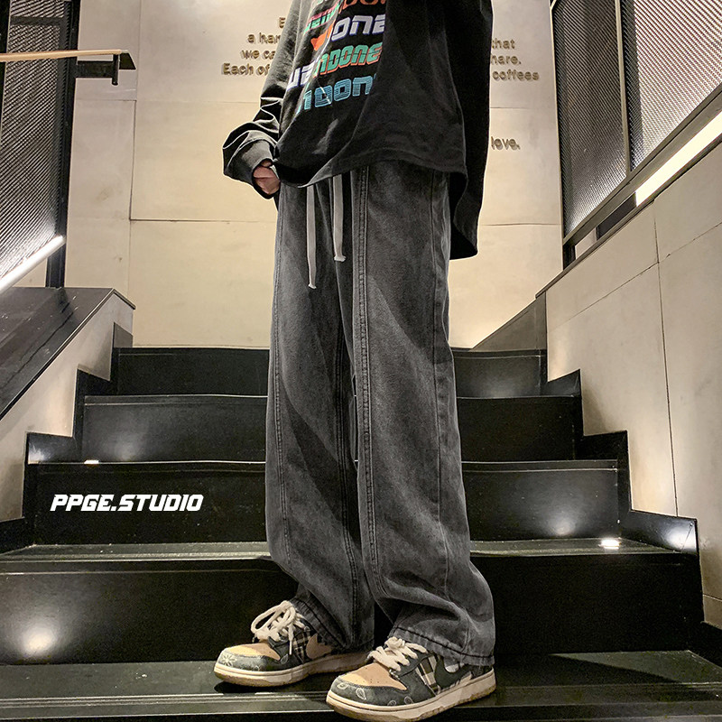 胖胖哥美式复古牛仔裤男款春季黑色直筒水洗阔腿长裤大码宽松裤子