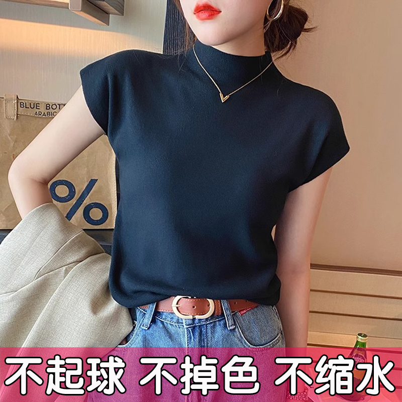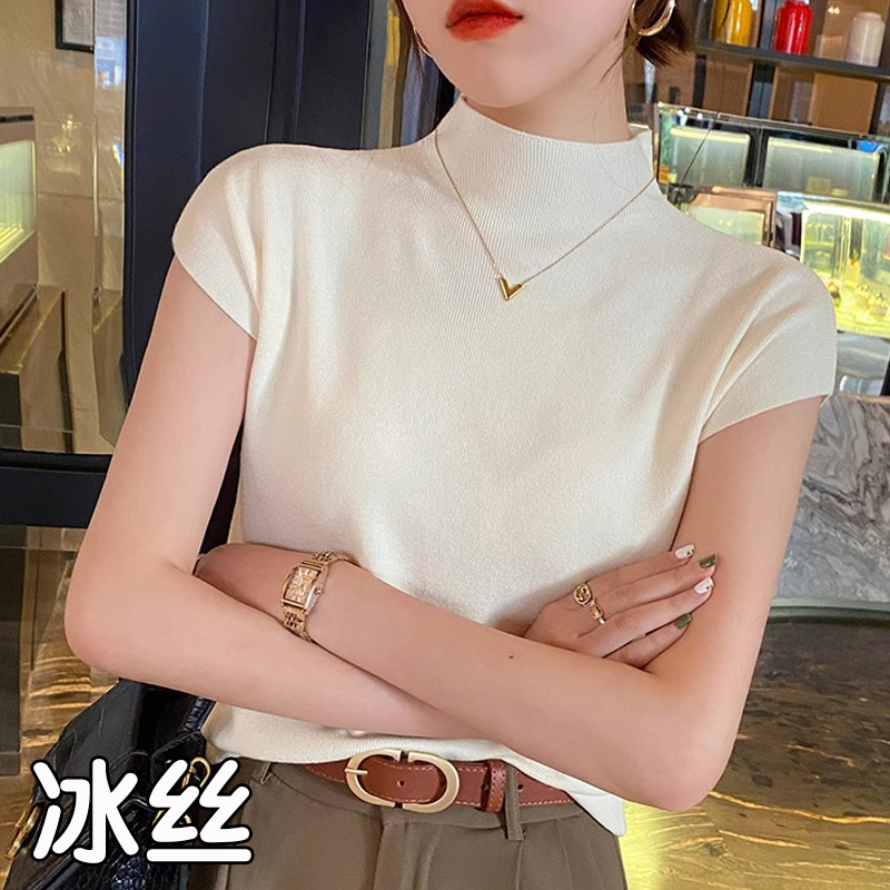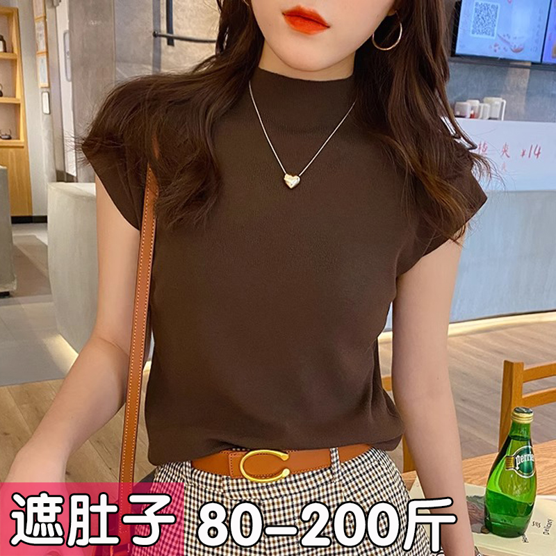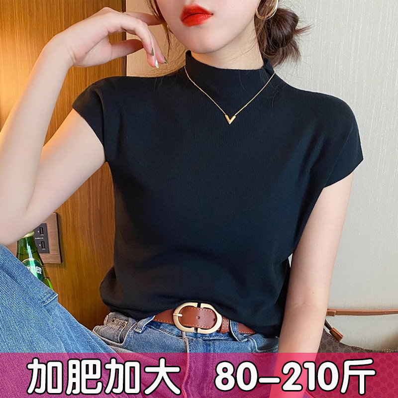大码半高领短袖t恤女针织打底衫内搭外穿正肩中领冰丝上衣胖mm夏