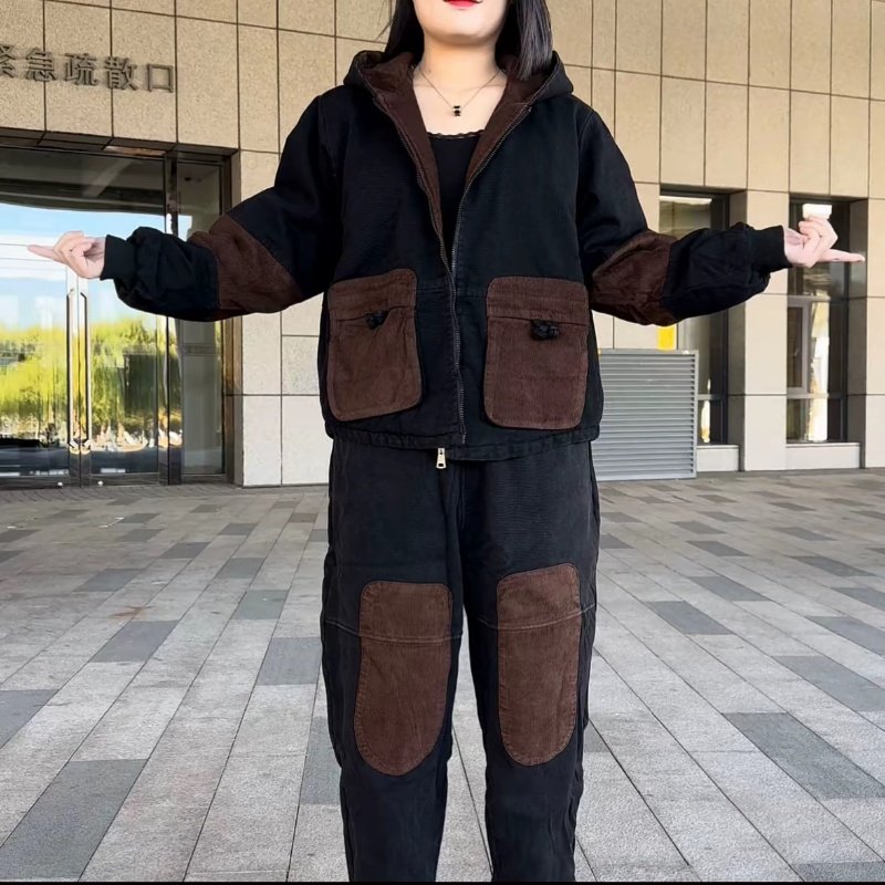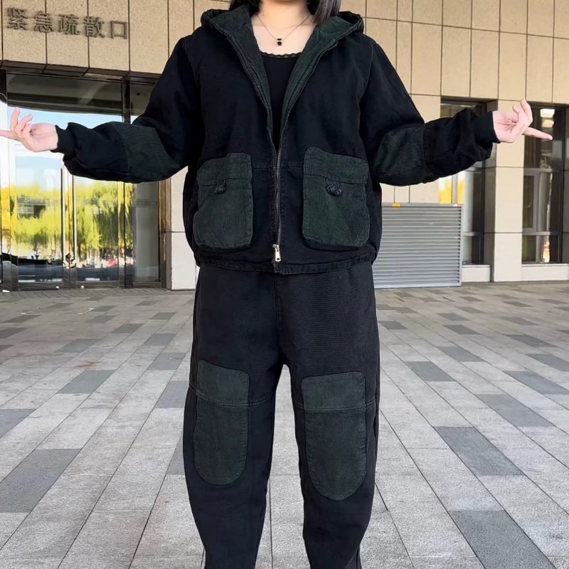加棉加厚复古连帽牛仔套装女