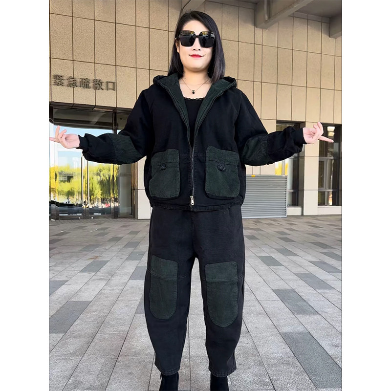 加棉加厚复古连帽牛仔套装女冬季洋气宽松洋气外套休闲裤两件套潮