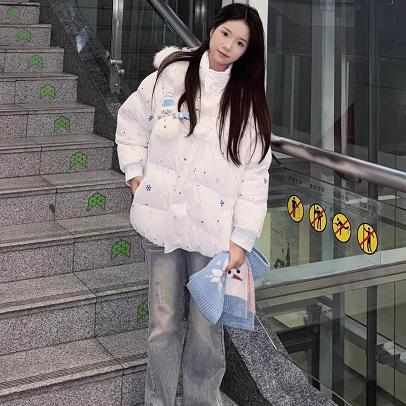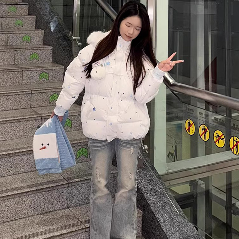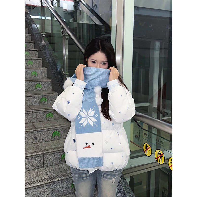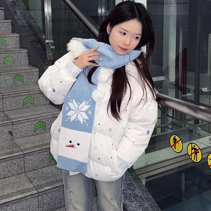 冬日温柔甜美感软妹雪花毛领连帽棉服+围巾宽松加厚保暖棉袄外套