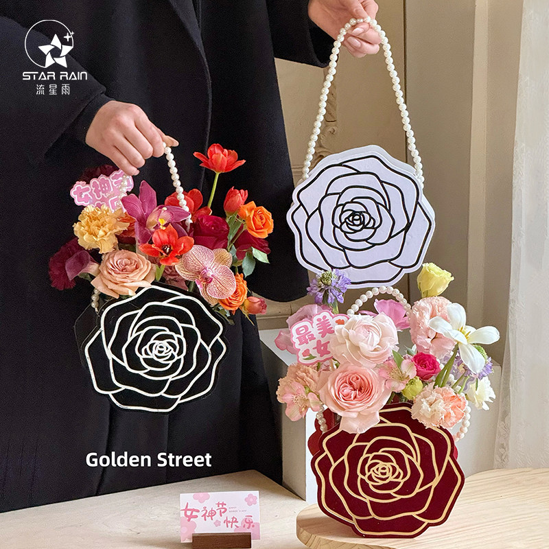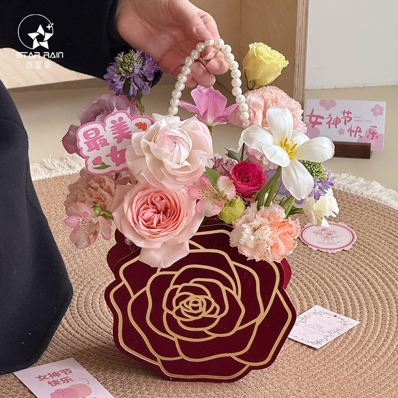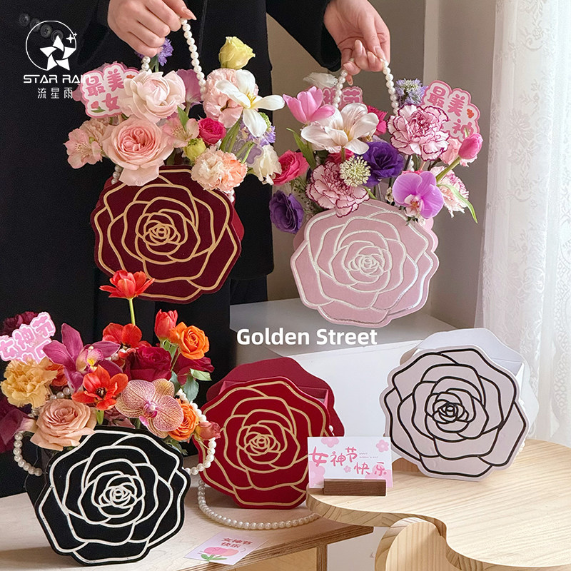 三八女神节山茶花手提珍珠花盒鲜花包装盒礼盒花束插花空盒子花艺