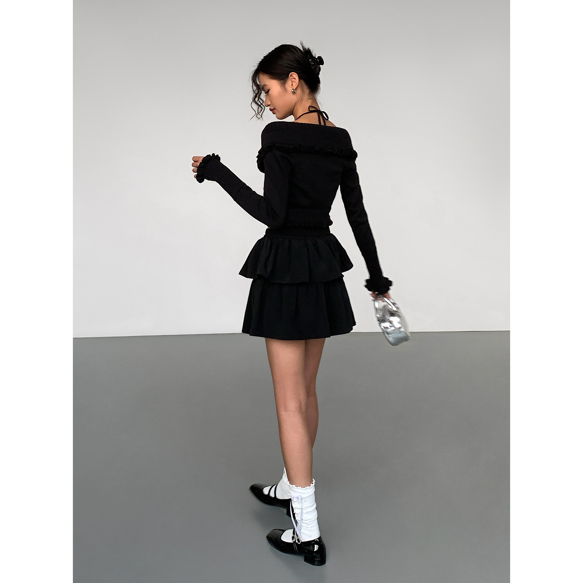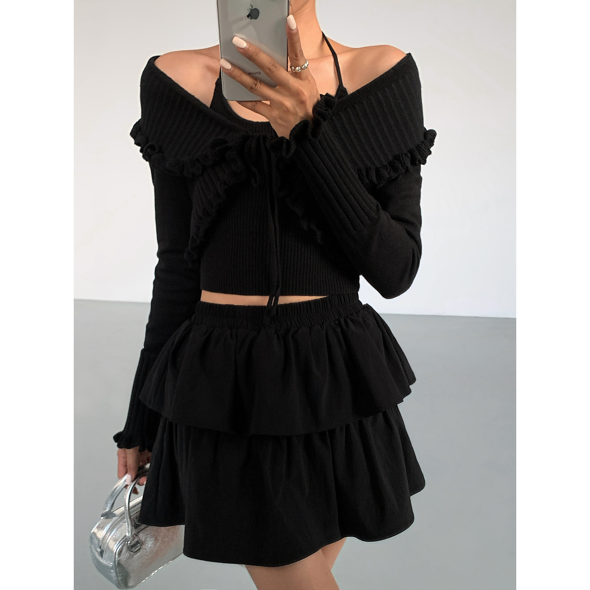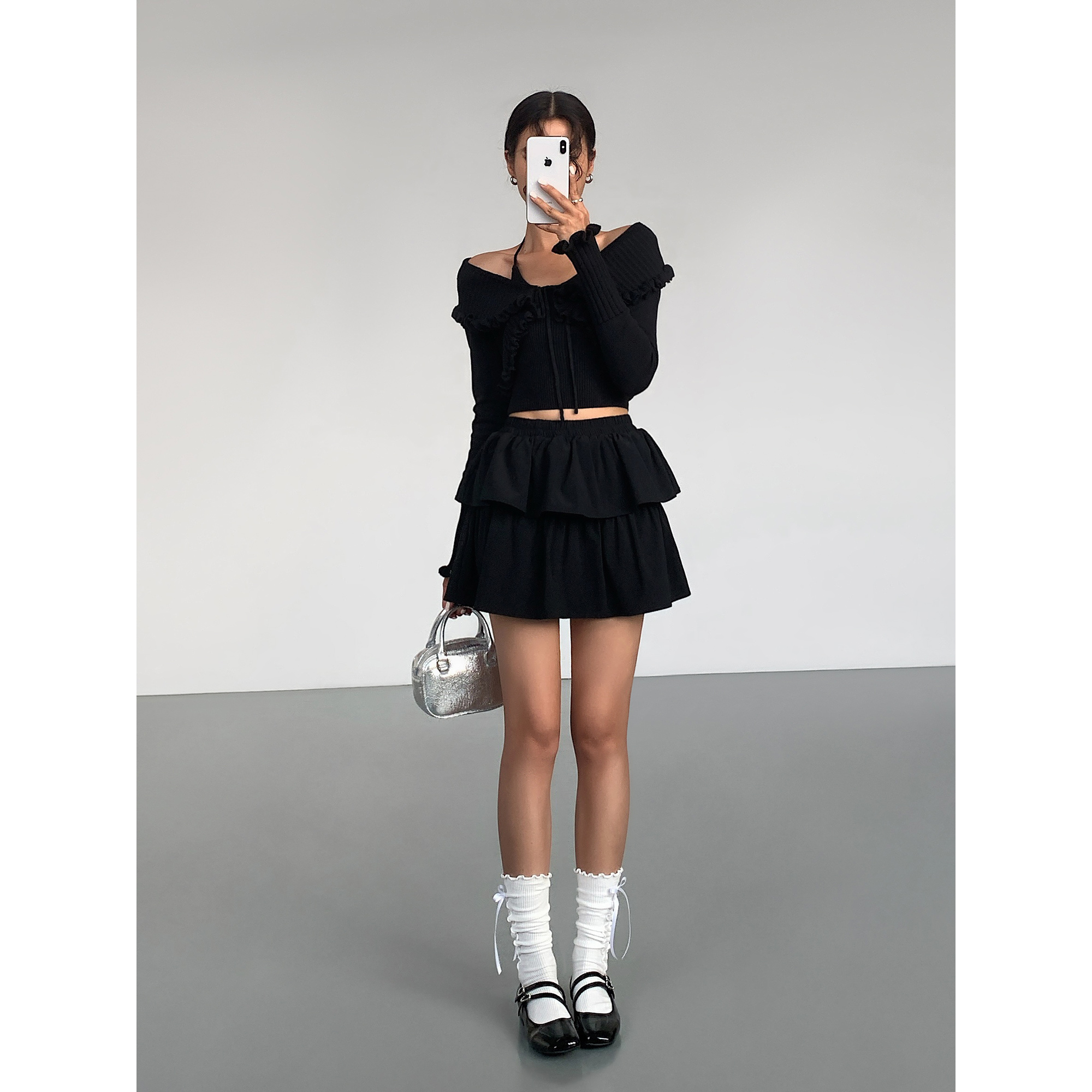 ousph 黑色花边翻领长袖针织开衫上衣女2025秋修身短款吊带两件套