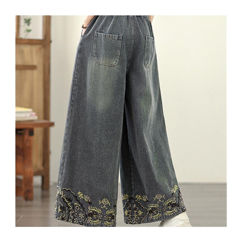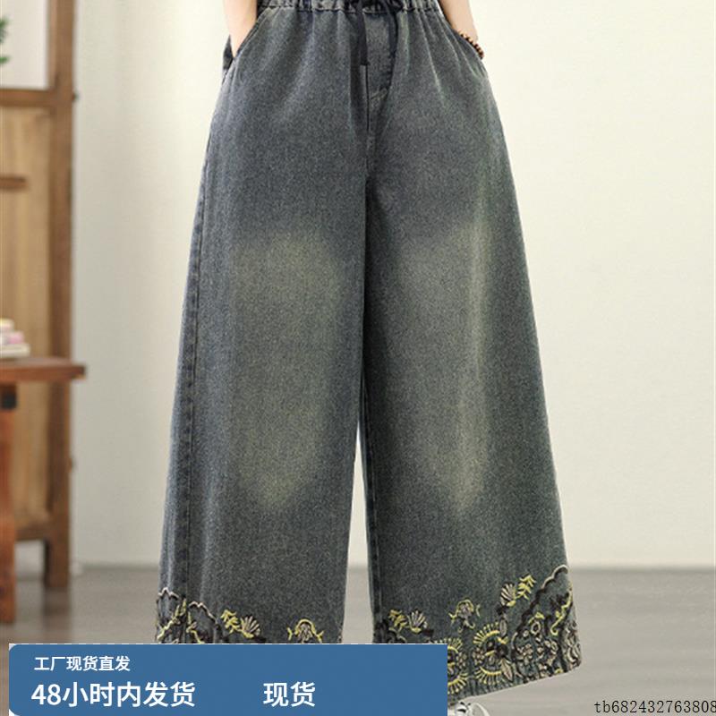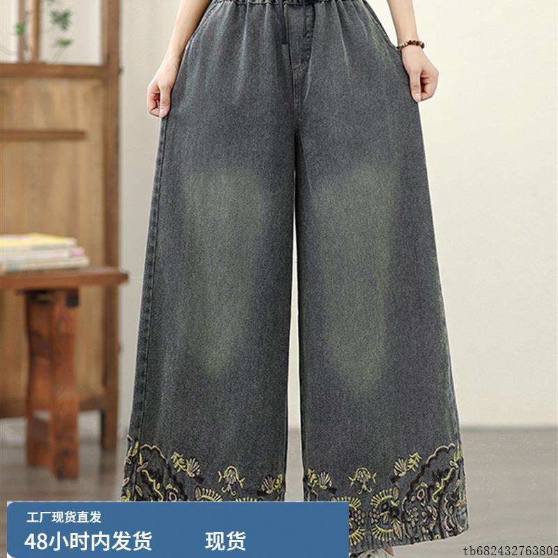 大码阔腿牛仔裤女士2025秋新款裤裙宽松直筒裤妈妈刺绣松紧腰裤子