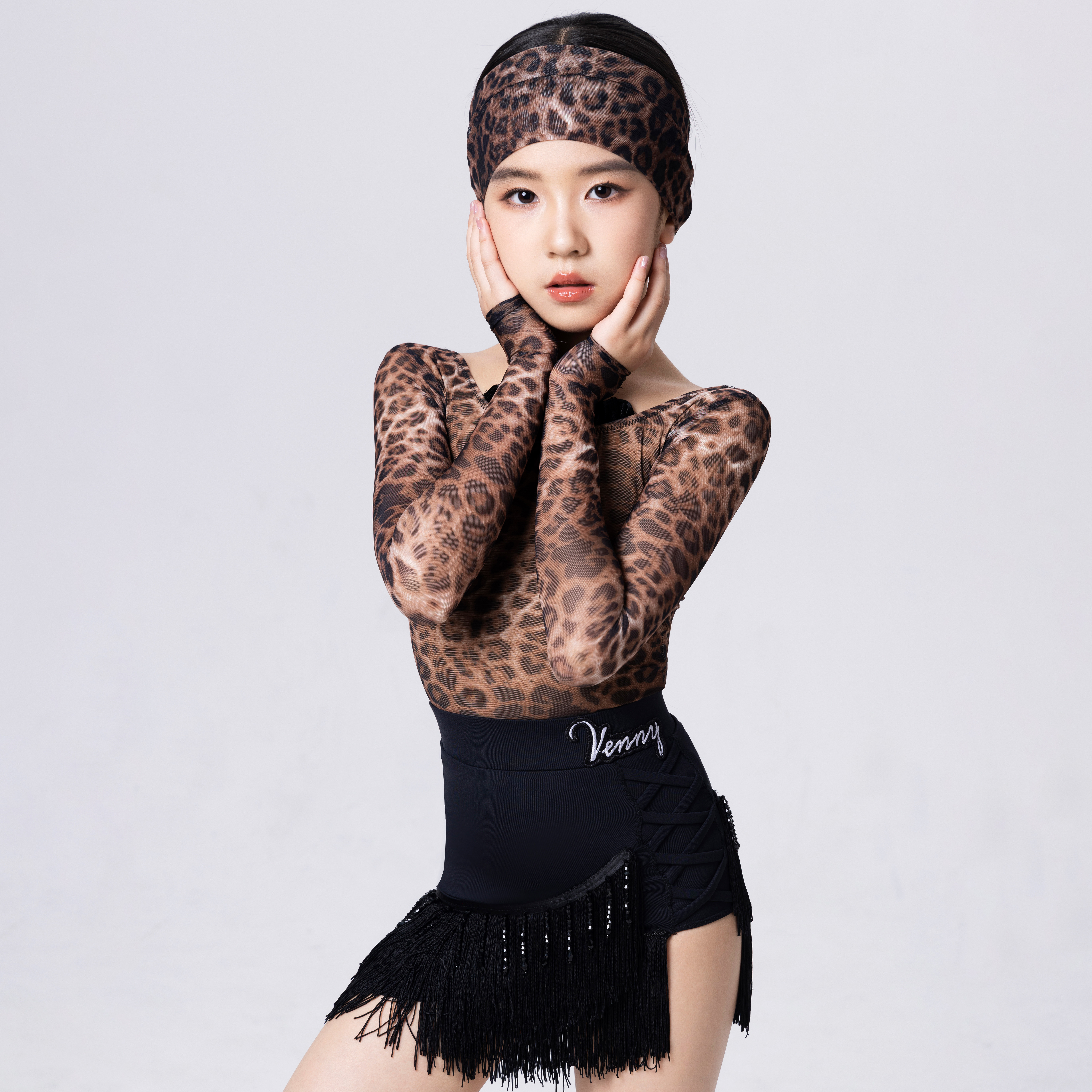Venny薇妮拉丁舞服新款女童练功服豹纹露背上衣流苏裙子训练套装