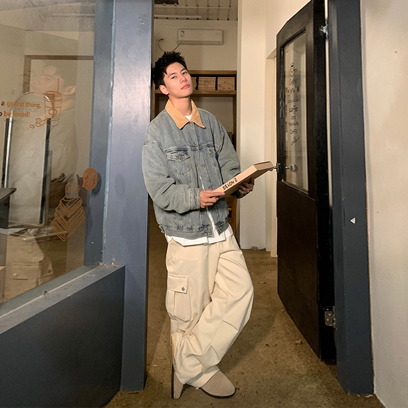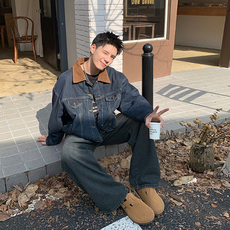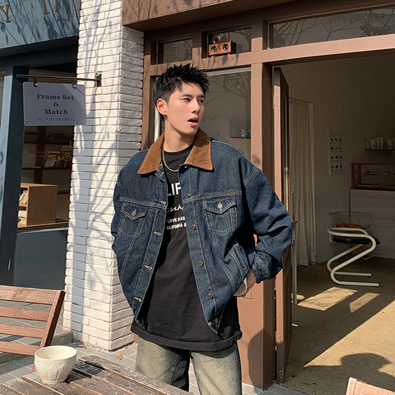 Holocene美式潮牌欧美嘻哈做旧拼色翻领牛仔夹克宽松加厚休闲外套