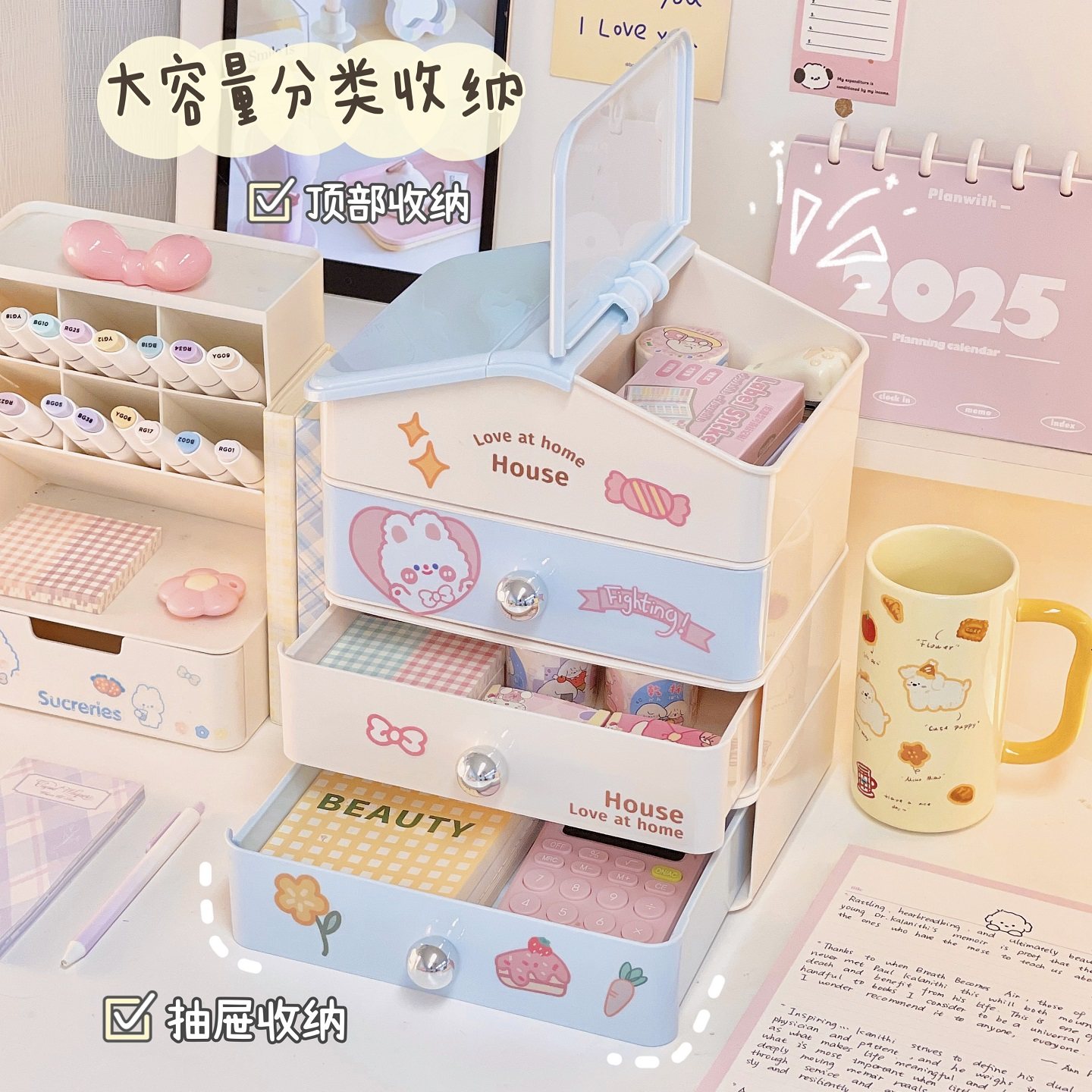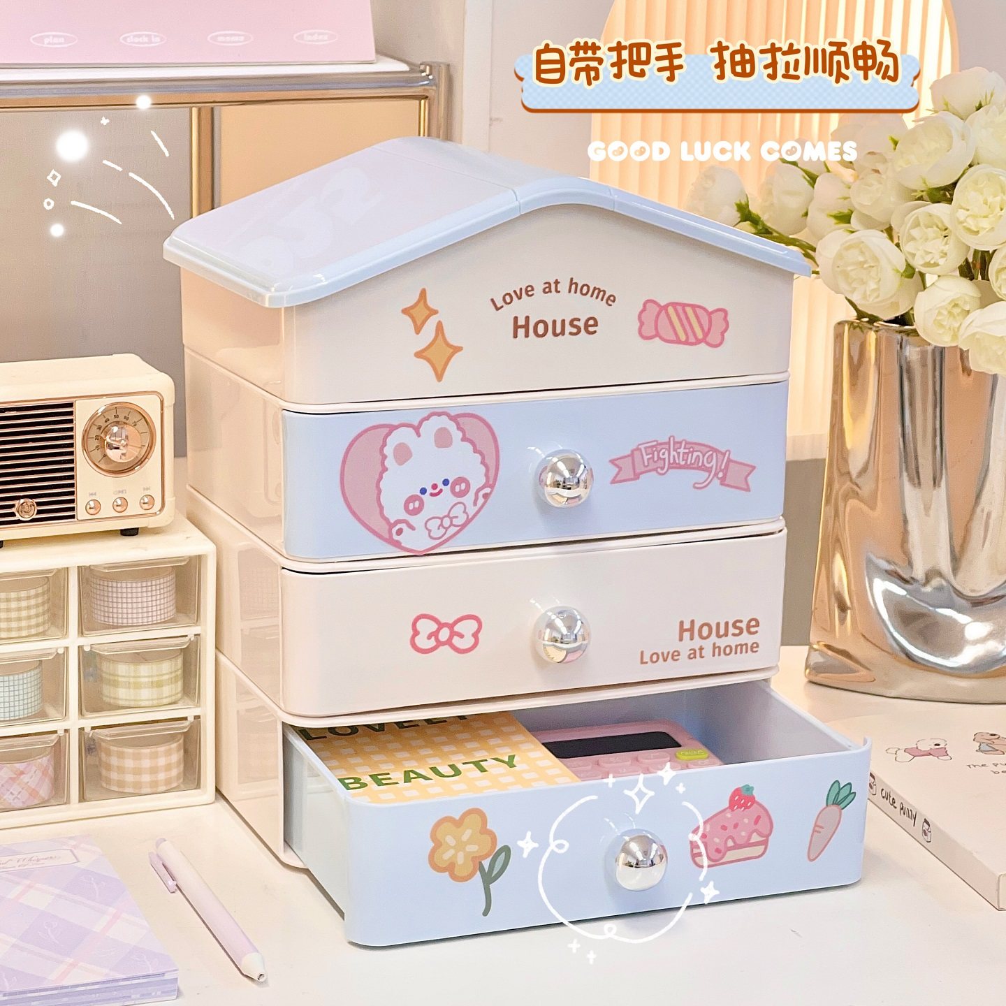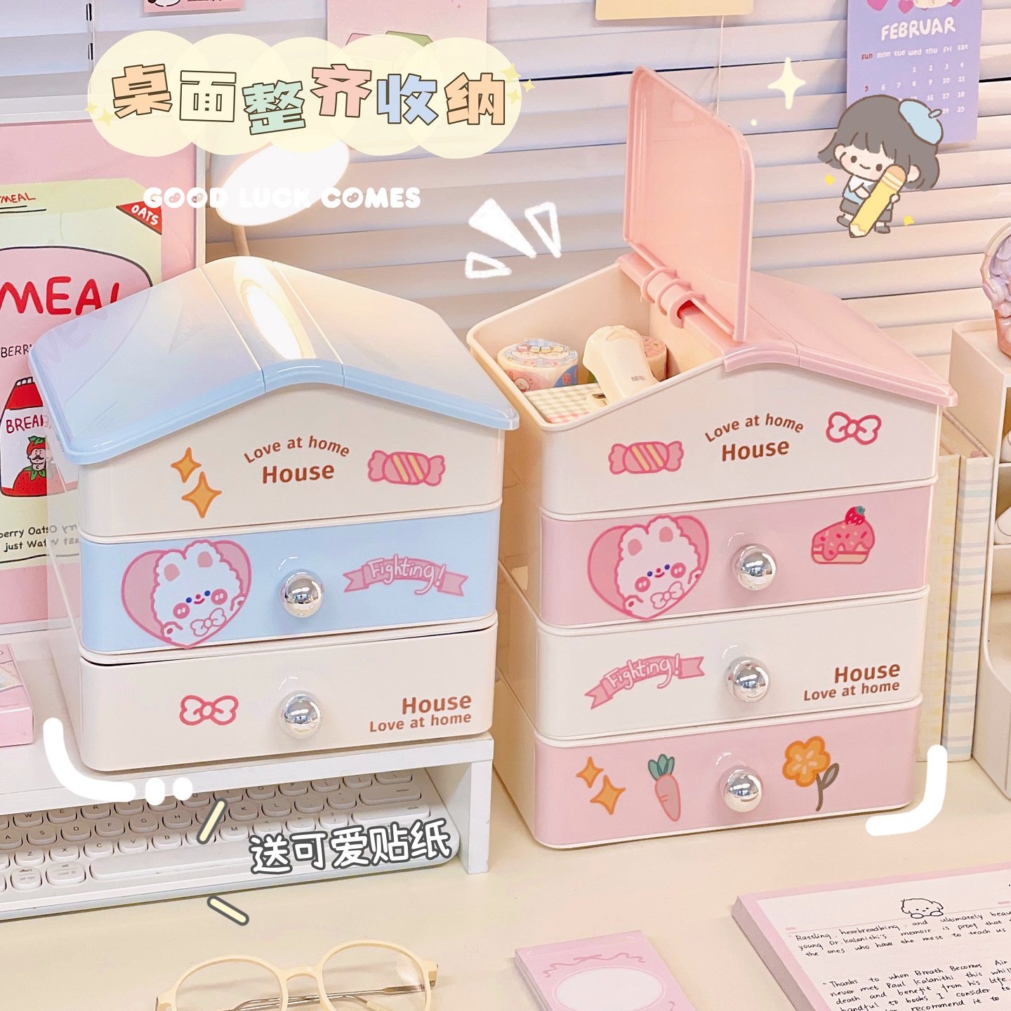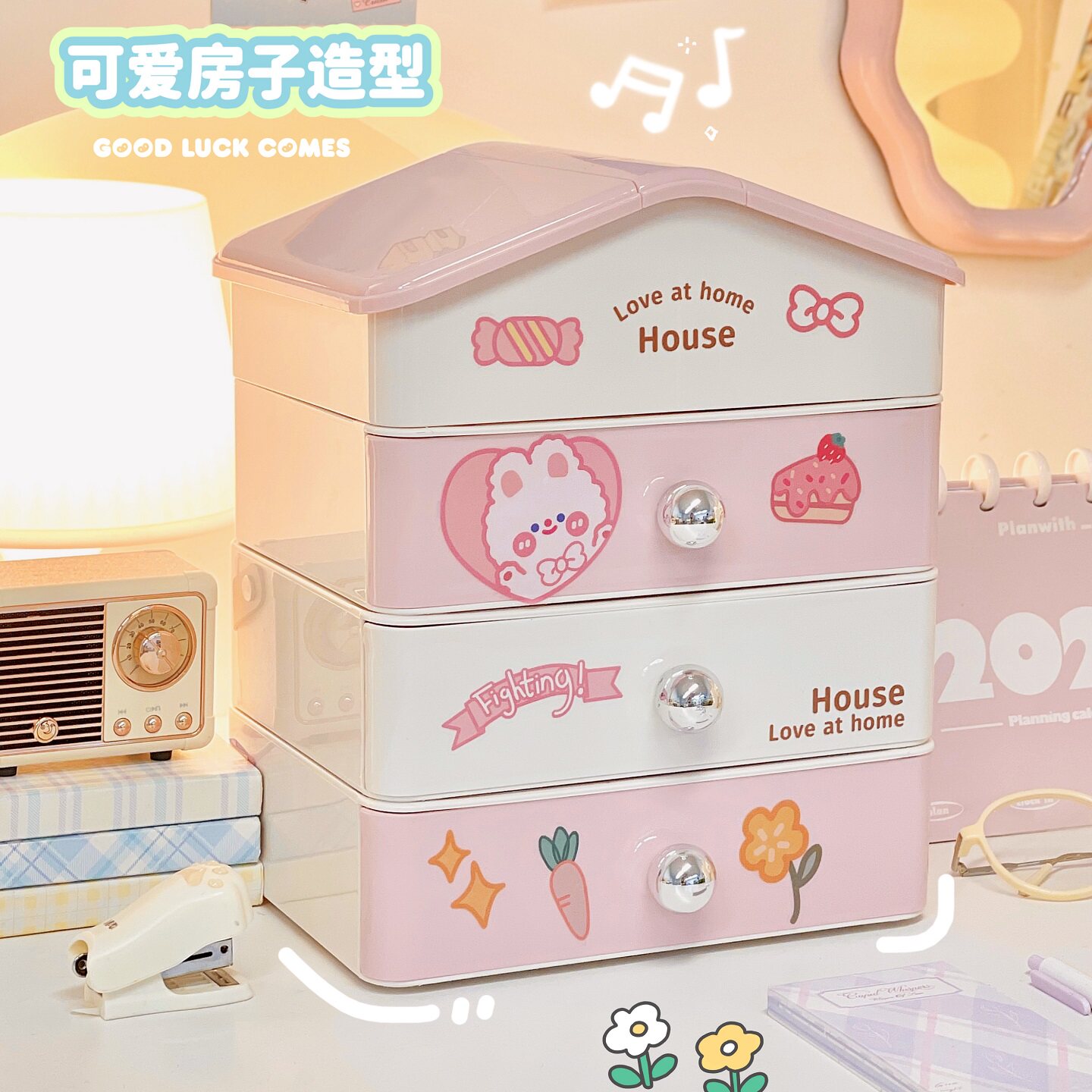 奶油风桌面可爱房子收纳盒可叠加抽屉式书桌办公室文具整理置物架