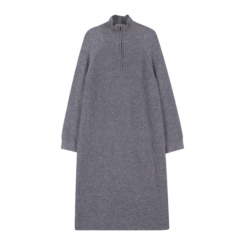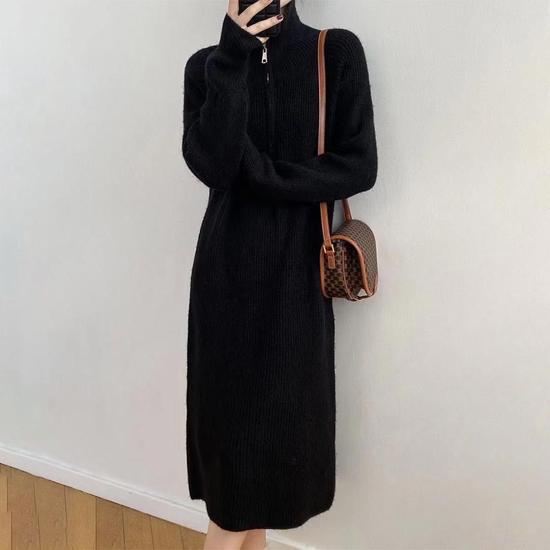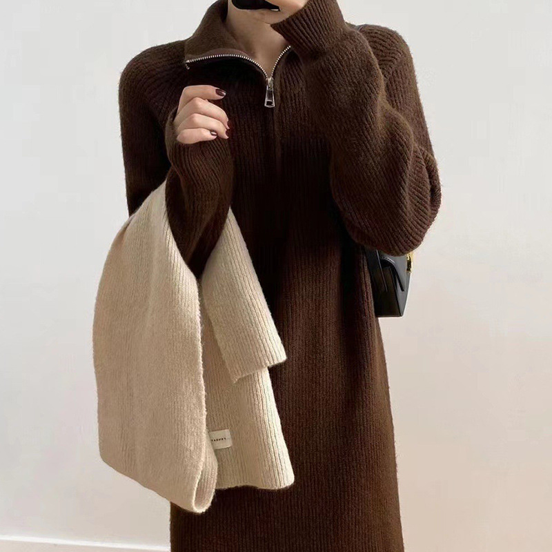 韩版慵懒风翻领宽松过膝毛衣裙女秋冬针织连衣裙中长款休闲直筒裙