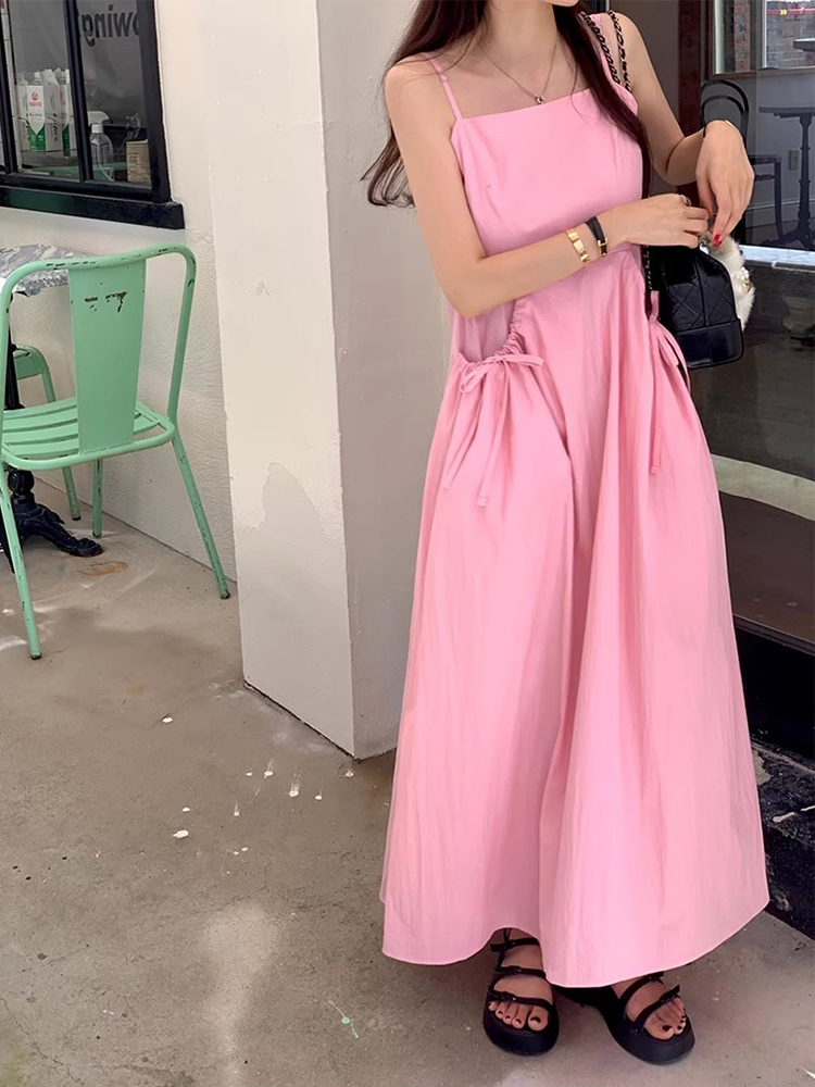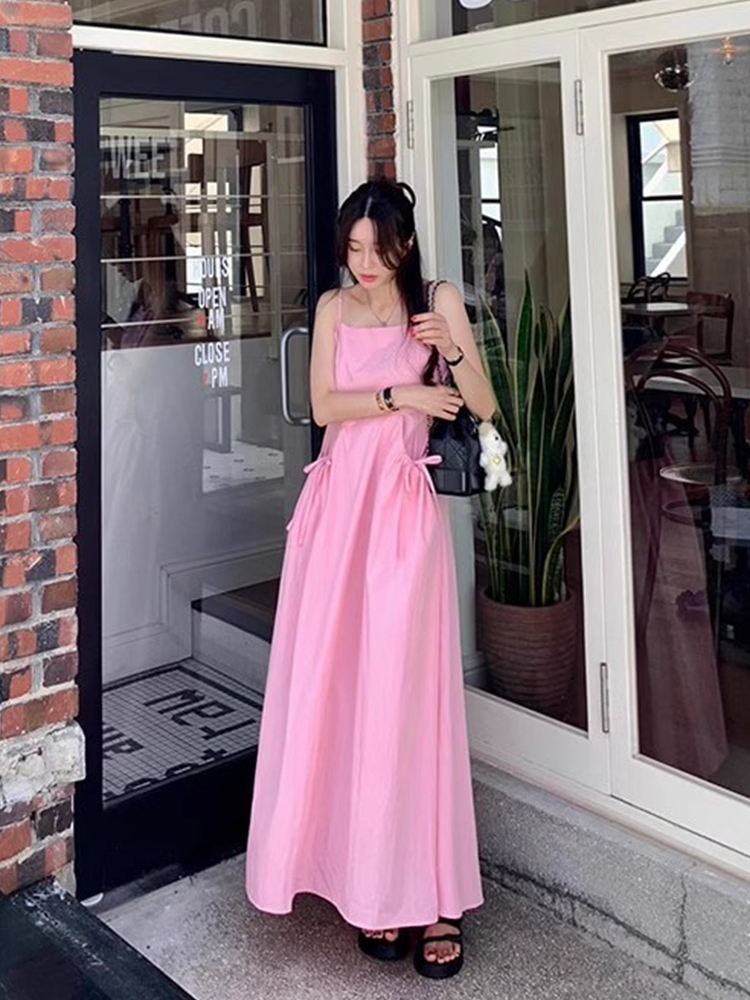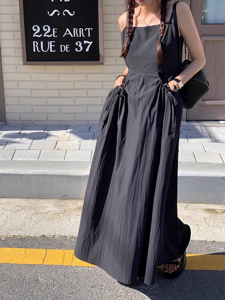 韩国chic夏季新款小众设计大口袋吊带连衣裙女高腰显瘦大摆长裙子