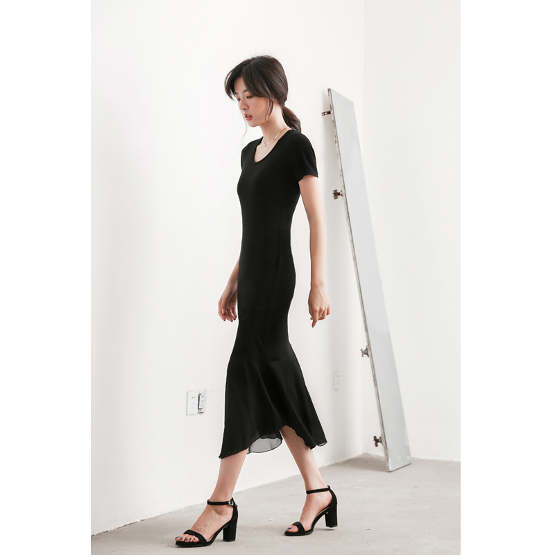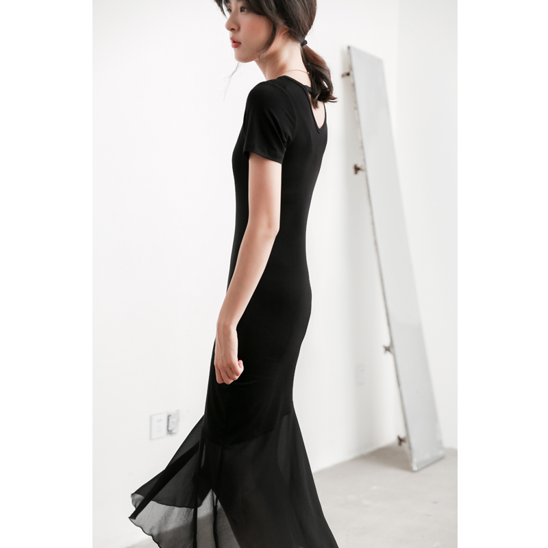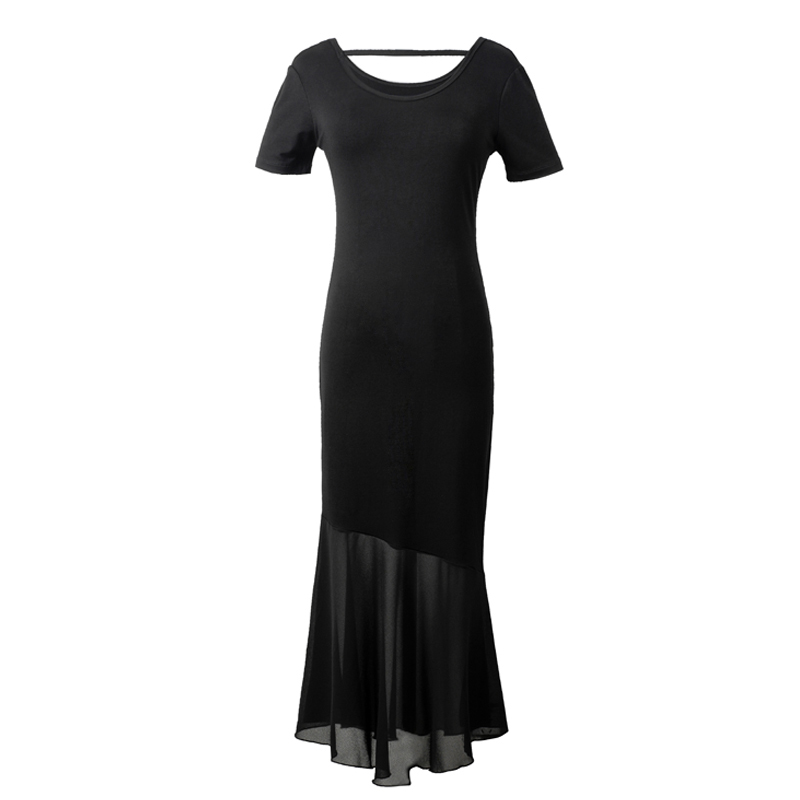 欧美风夏季女装莫代尔连衣裙露背长裙雪纺拼接短袖鱼尾裙大码小码