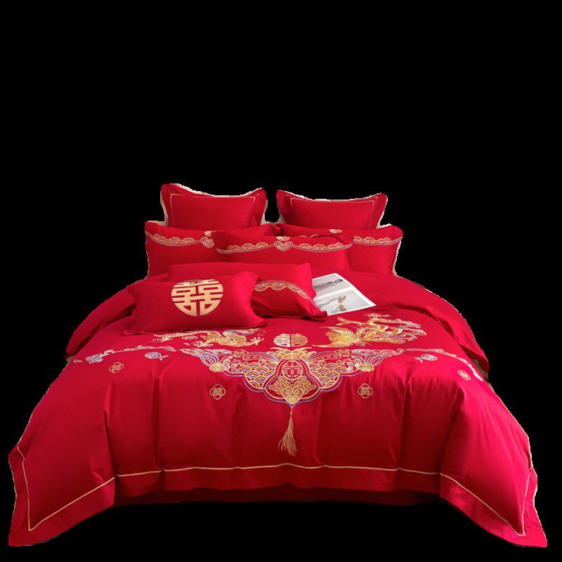 新中式高档龙凤刺绣结婚四件套红色床单喜被全棉陪嫁婚庆床上用品