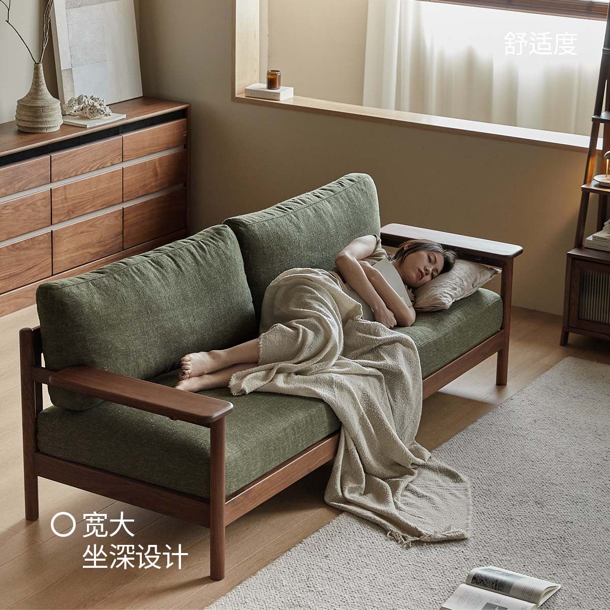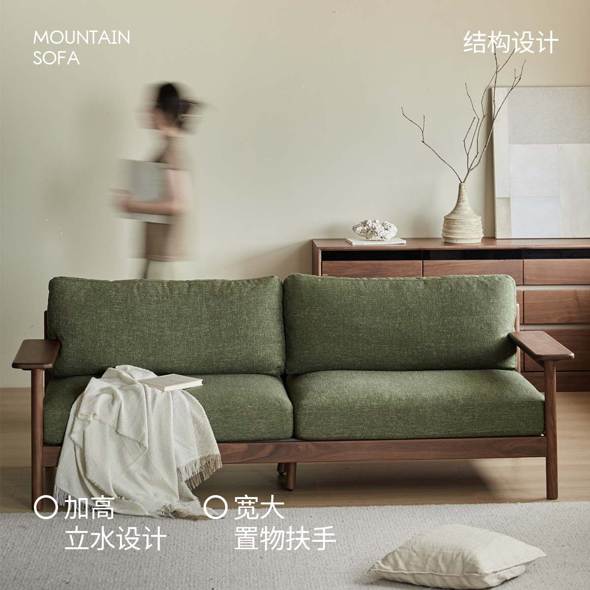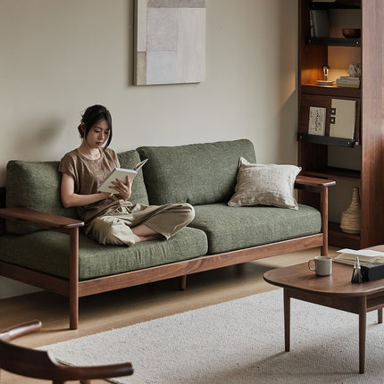 出乎家具山间沙发北欧实木客厅可拆洗布艺沙发黑胡桃木小户型直排