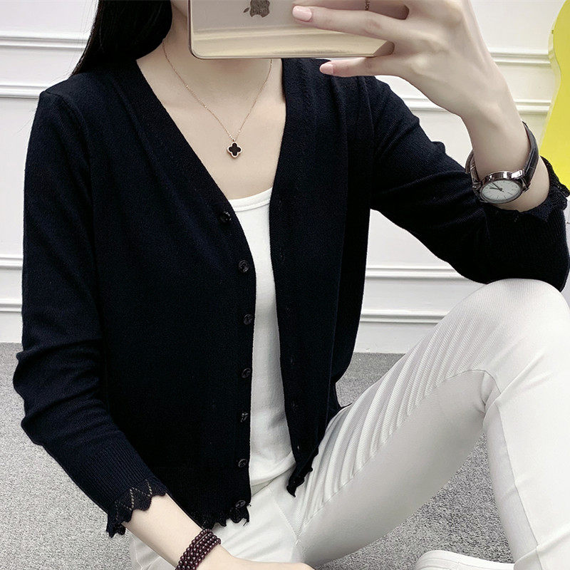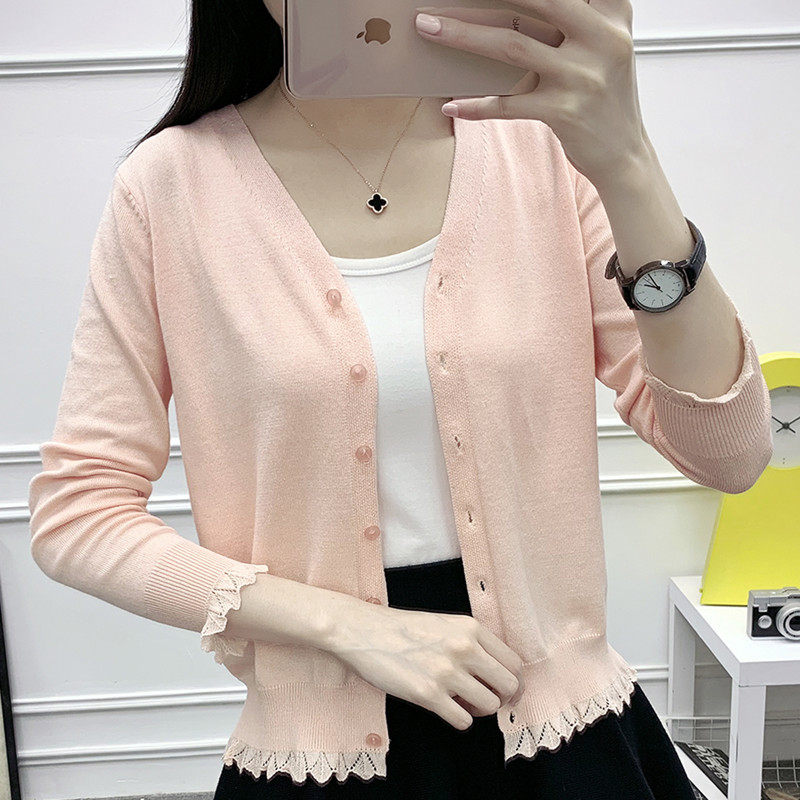 夏季短款针织开衫女春秋外搭薄款长袖小披肩v领上衣女士毛衣外套