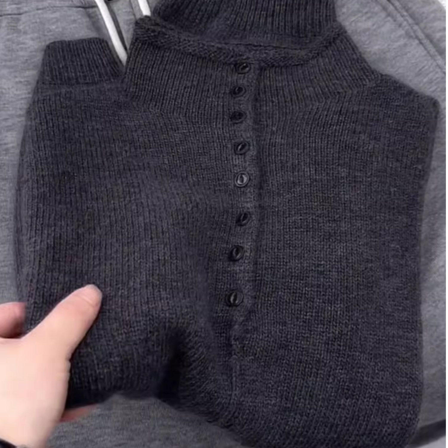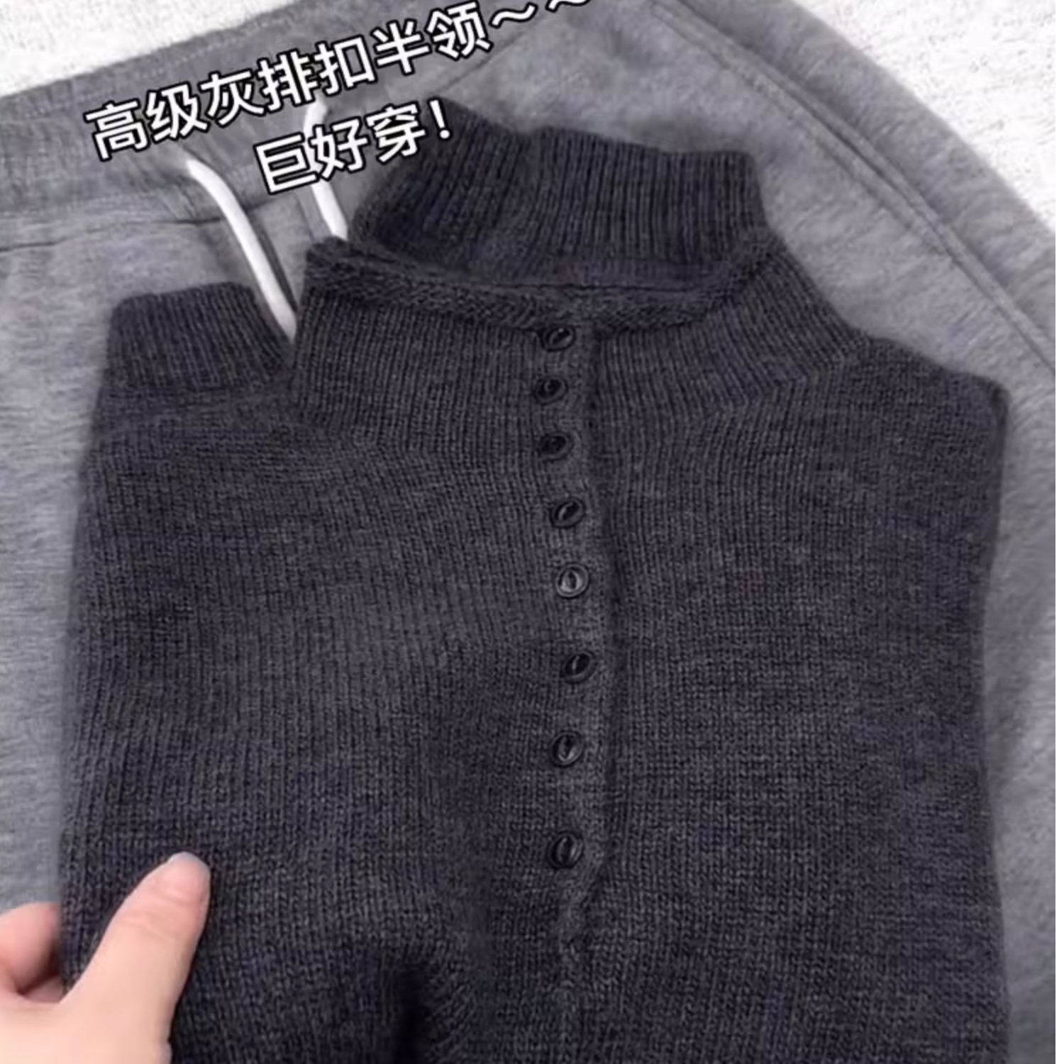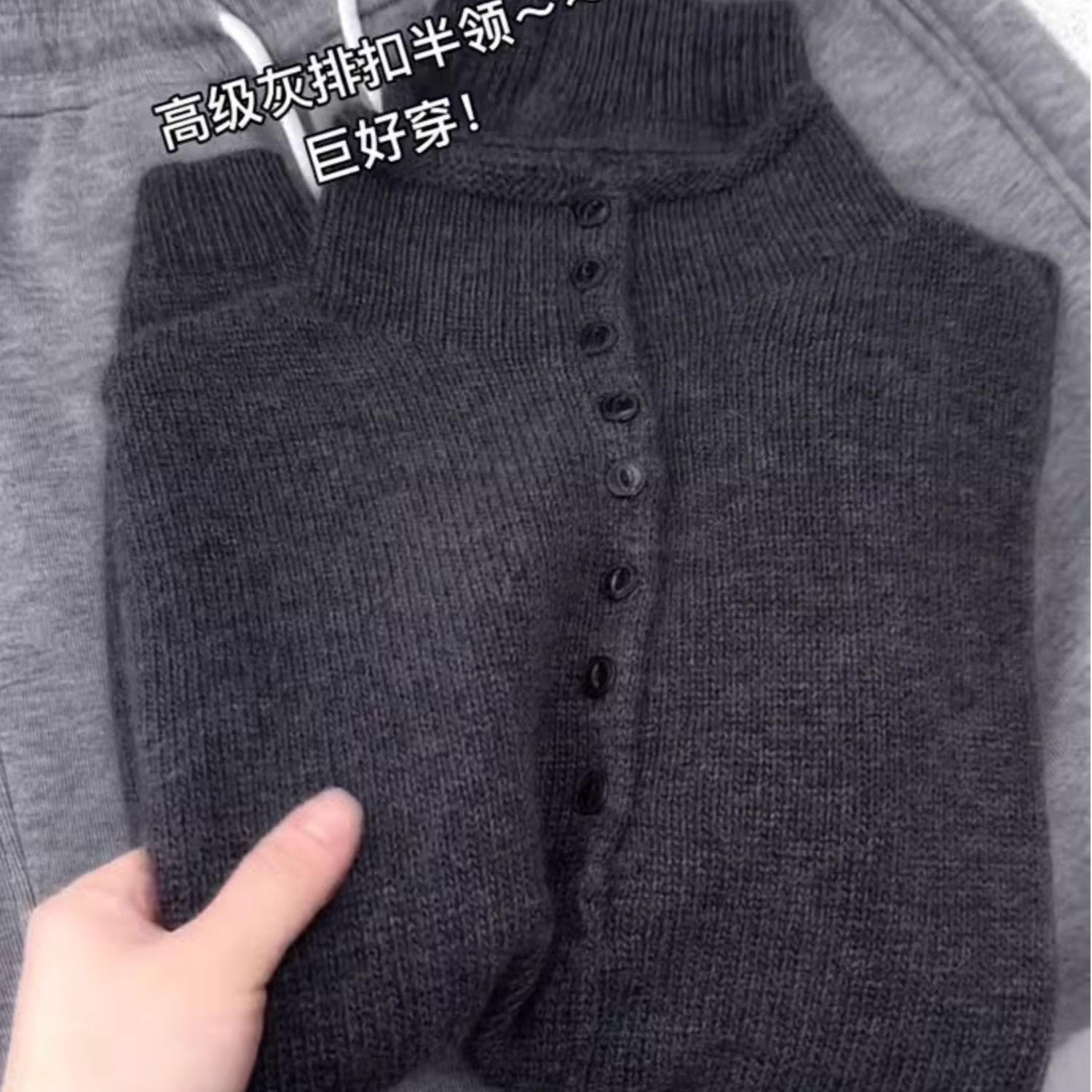 秋冬韩系深灰色半高领多纽扣针织衫女宽松显瘦软糯毛衣高级感上衣