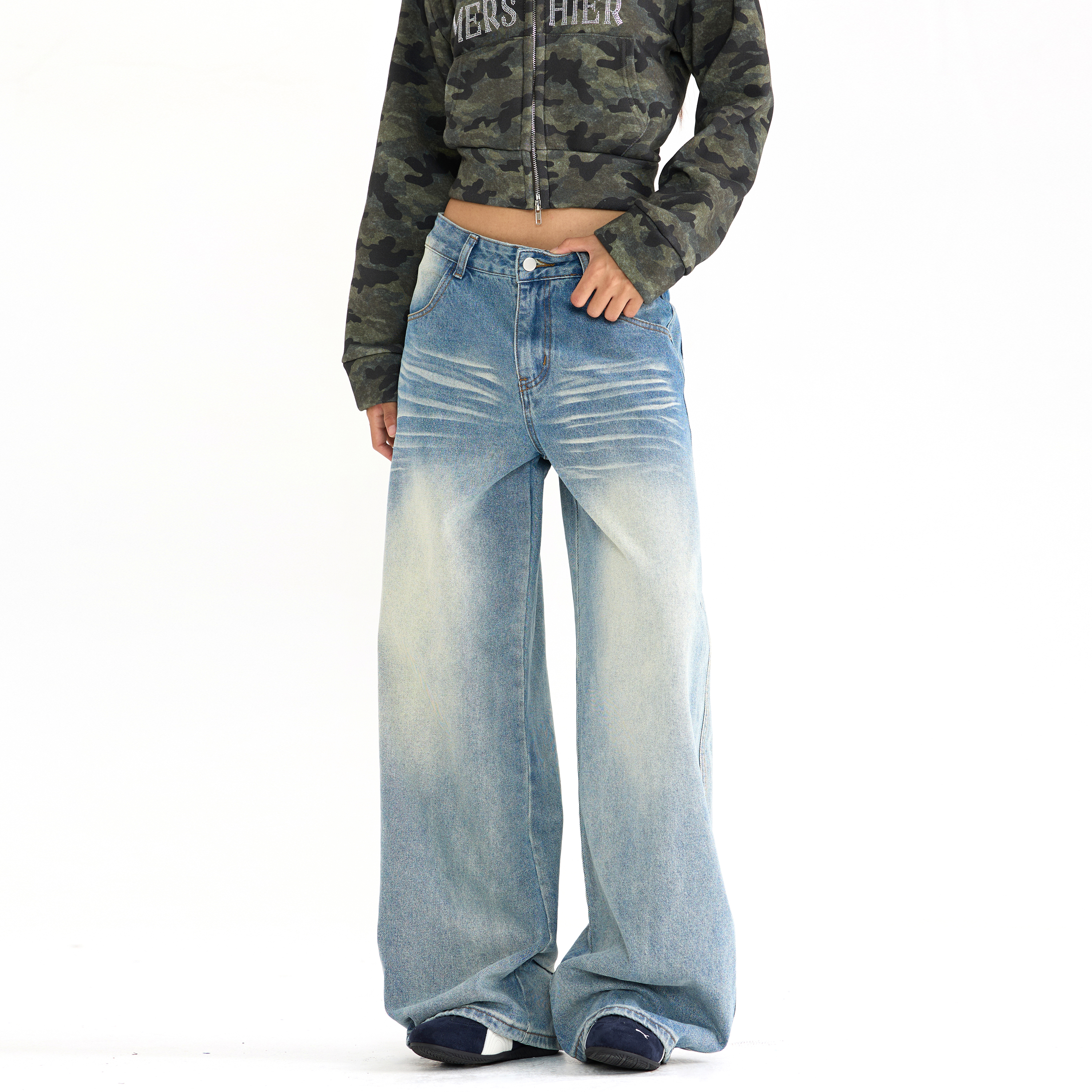 美式刺绣牛仔裤男女复古潮牌秋冬宽松直筒阔腿休闲弯刀拖地裤子