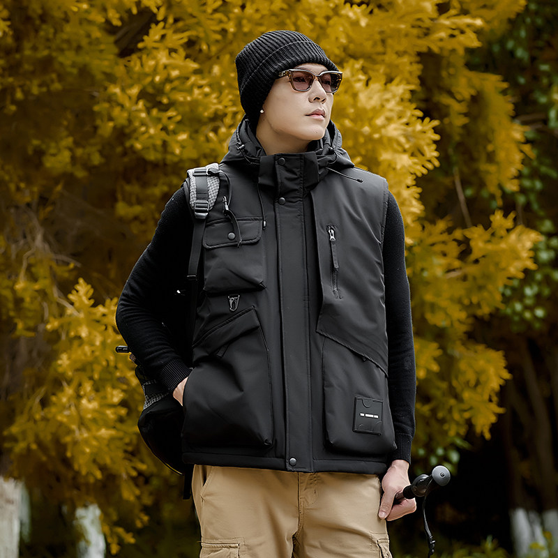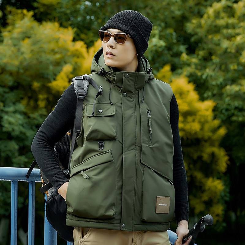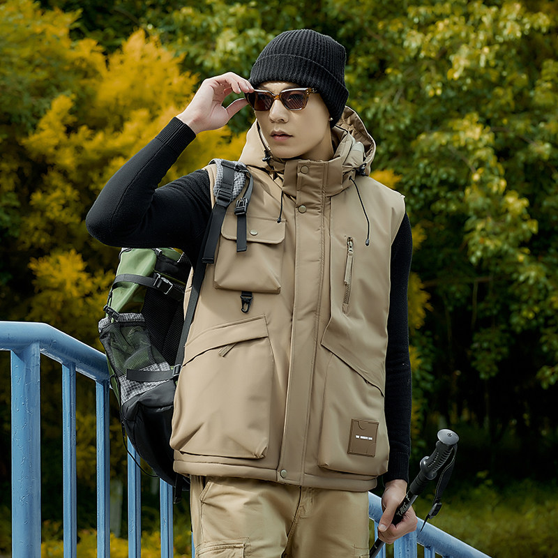加绒工装马甲男女多口袋加厚保暖春秋季户外坎肩外套防风连帽背心