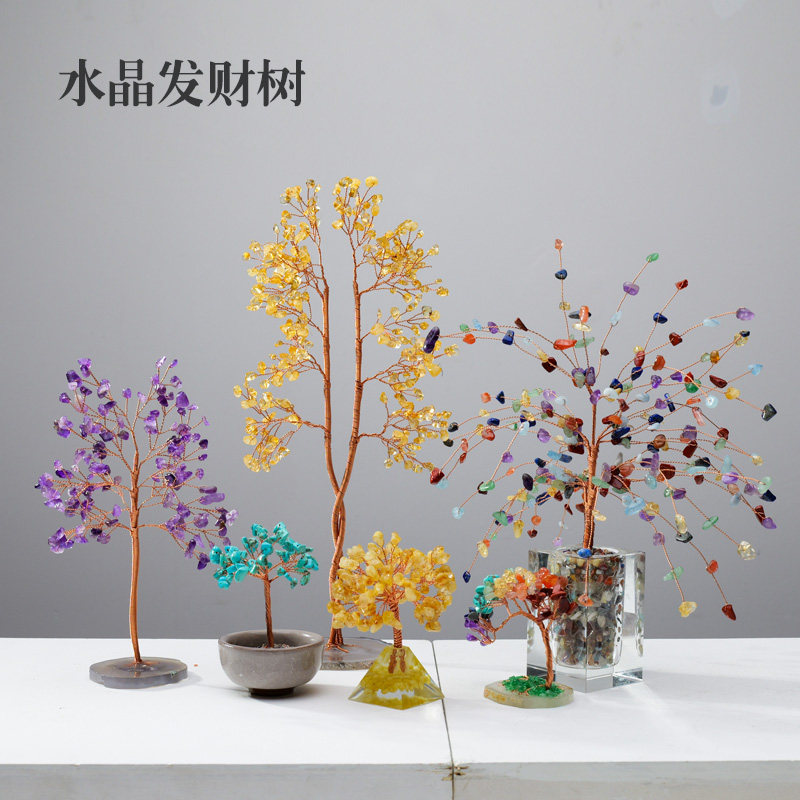迷你天然粉水晶树摆件办公室桌面发财树家居装饰乔迁紫黄原创礼物