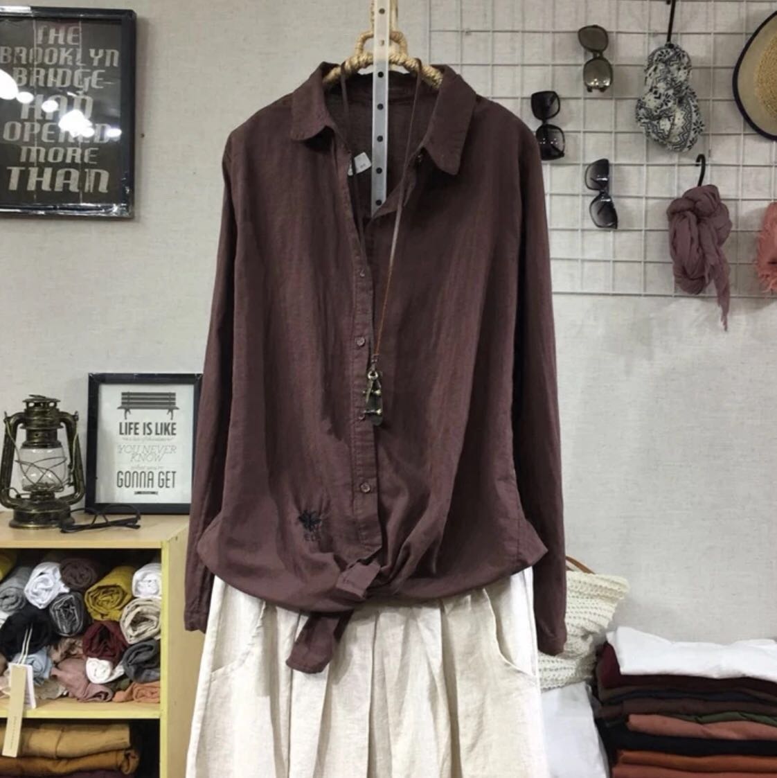 2023春季新款韩版宽松文艺纯色翻领长袖亚麻衬衫女棉麻开衫衬衣