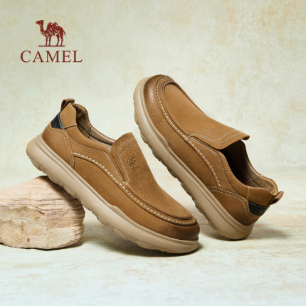 骆驼男鞋2025秋季新款舒适透气轻盈宽头套脚耐磨卡其乐福休闲皮鞋