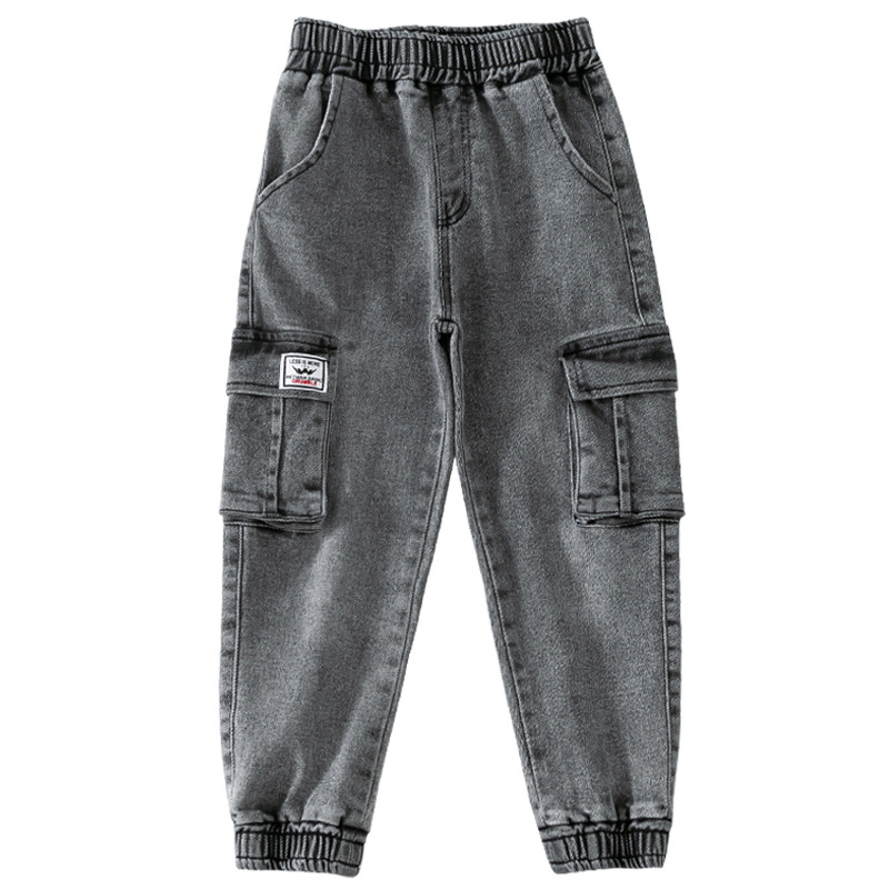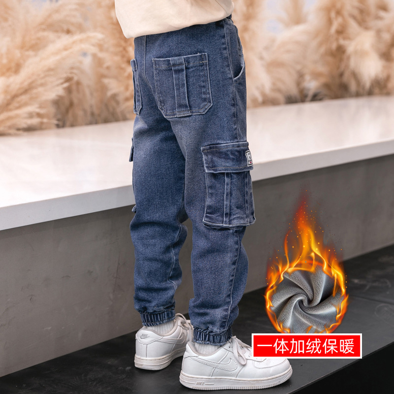 男童工装牛仔裤秋冬新款中大童加绒休闲长裤男孩炸街帅气束脚裤子