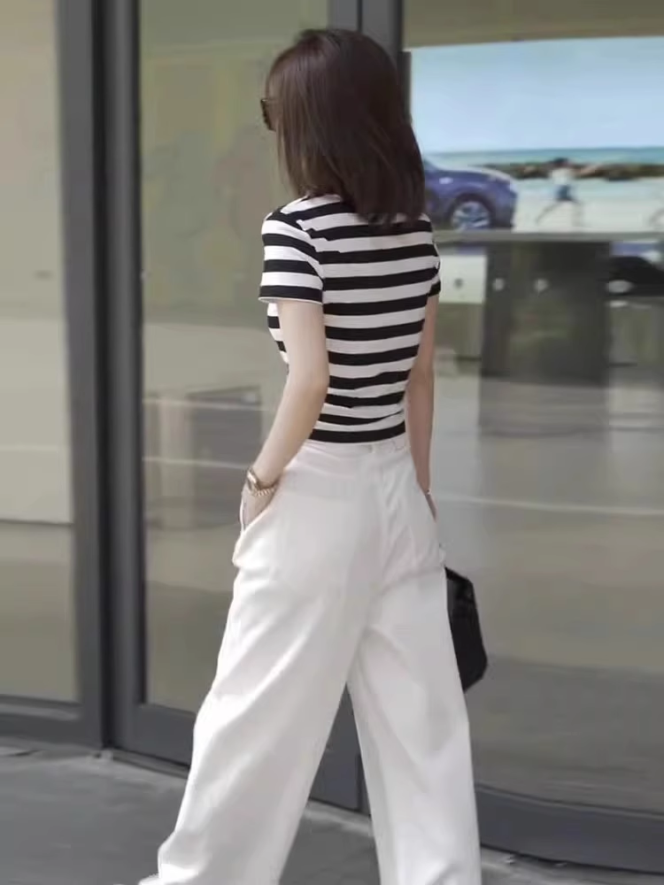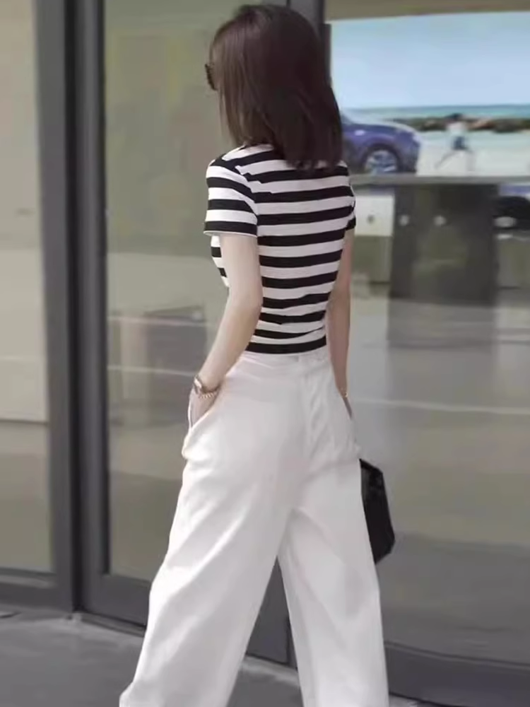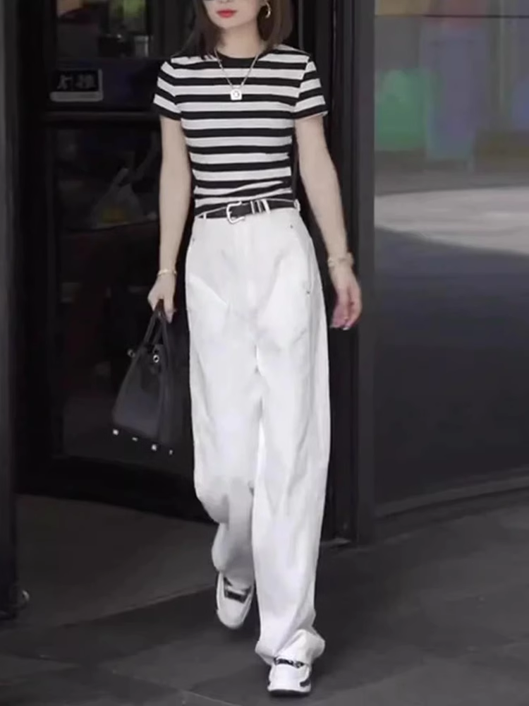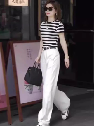 欧货炸街撞色条纹圆领短袖两件套