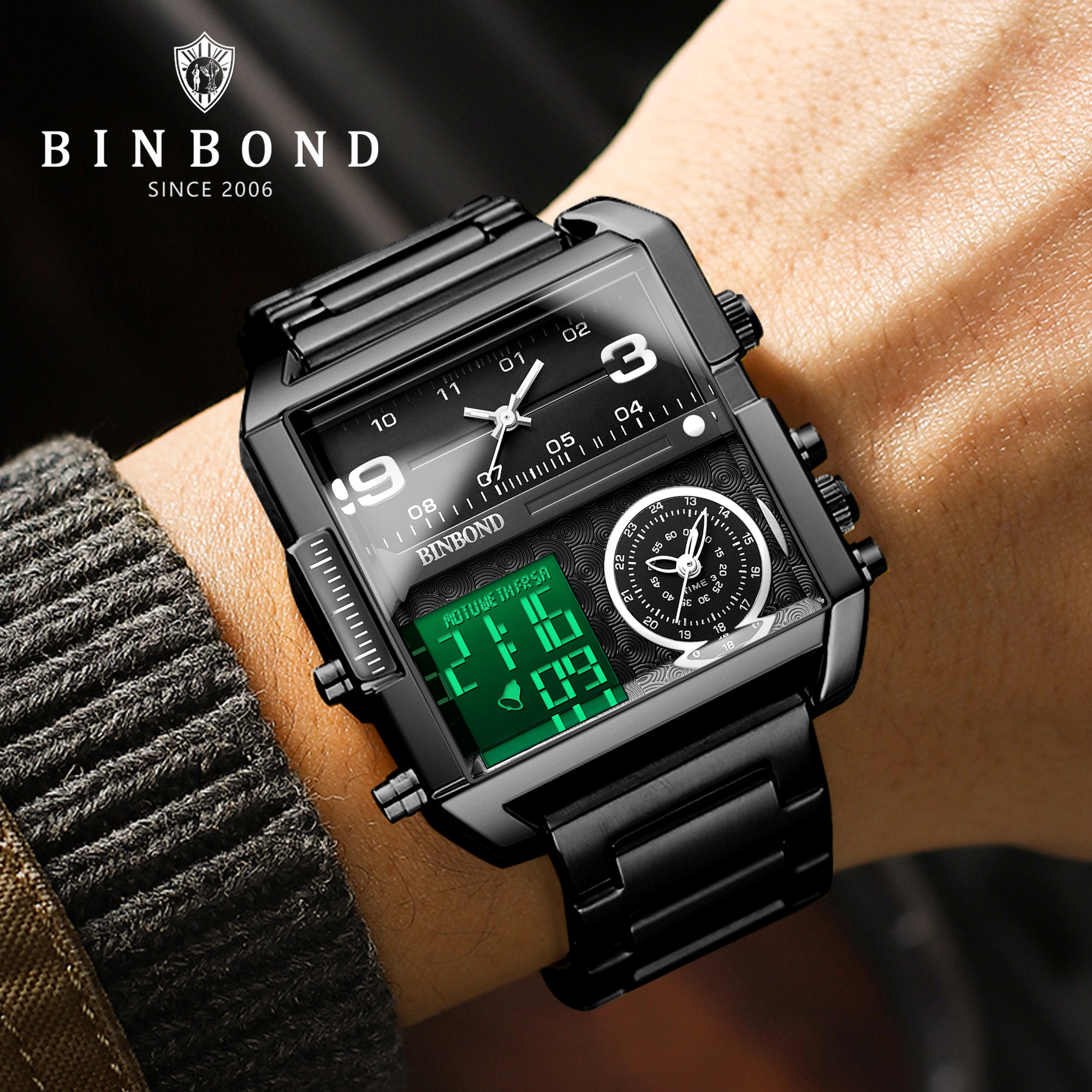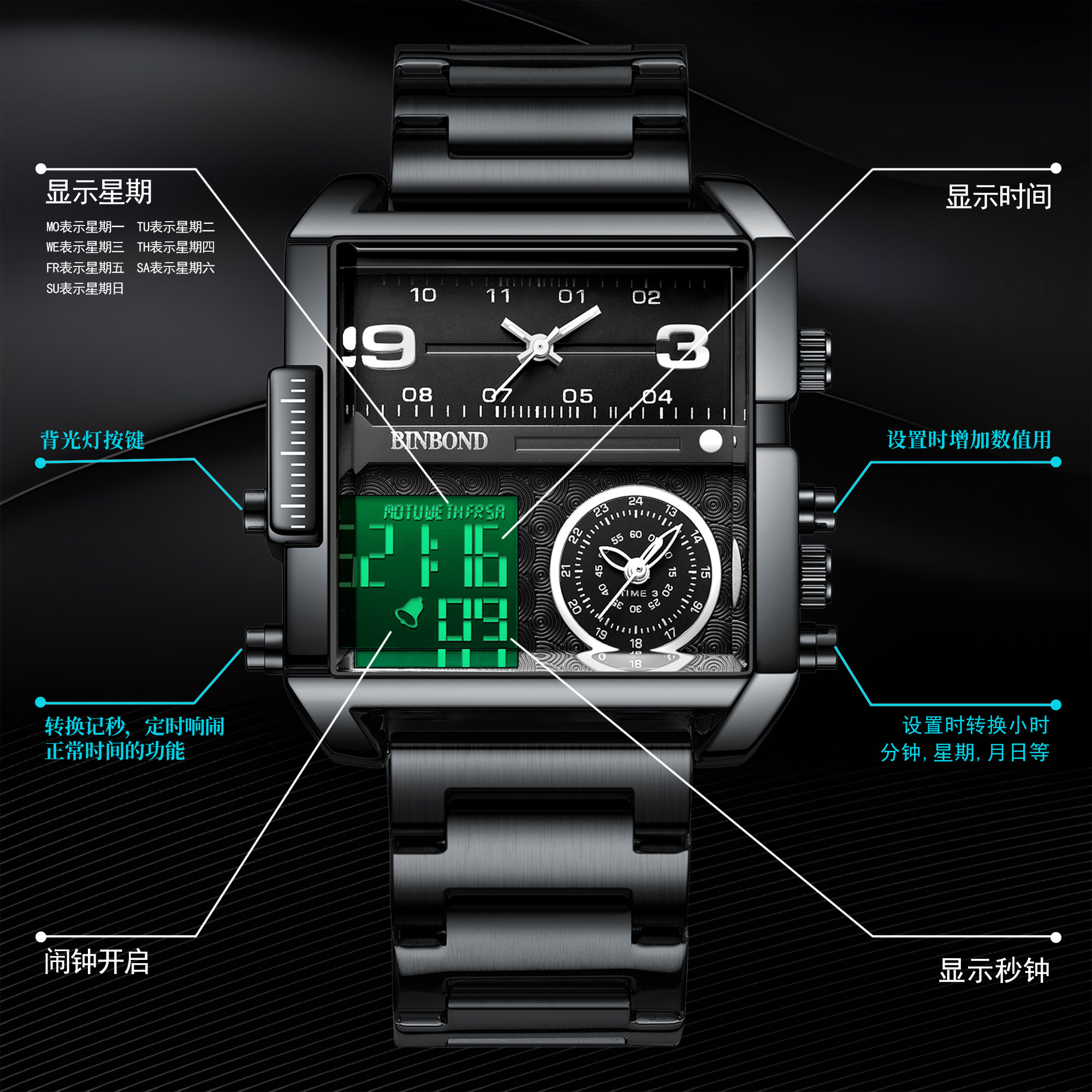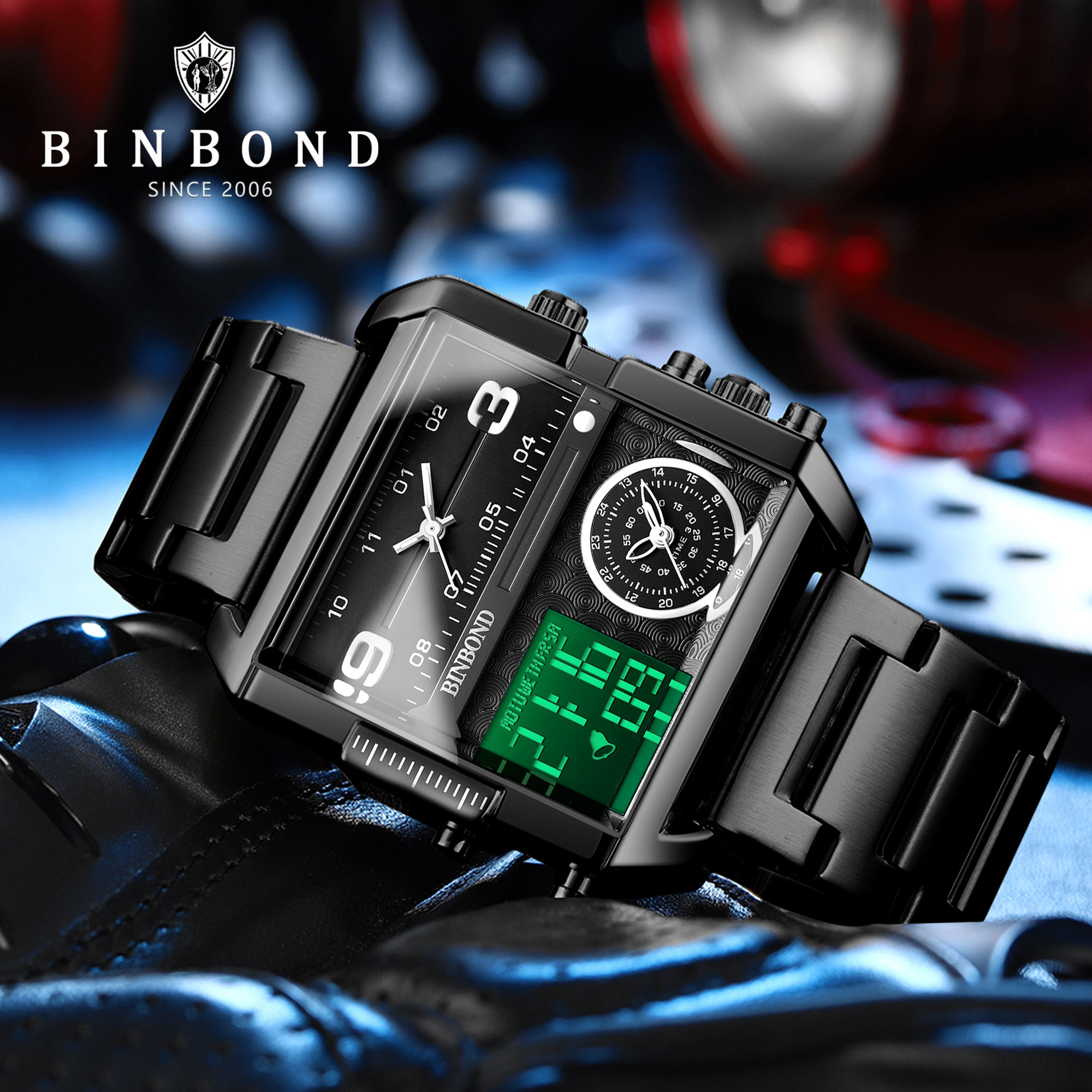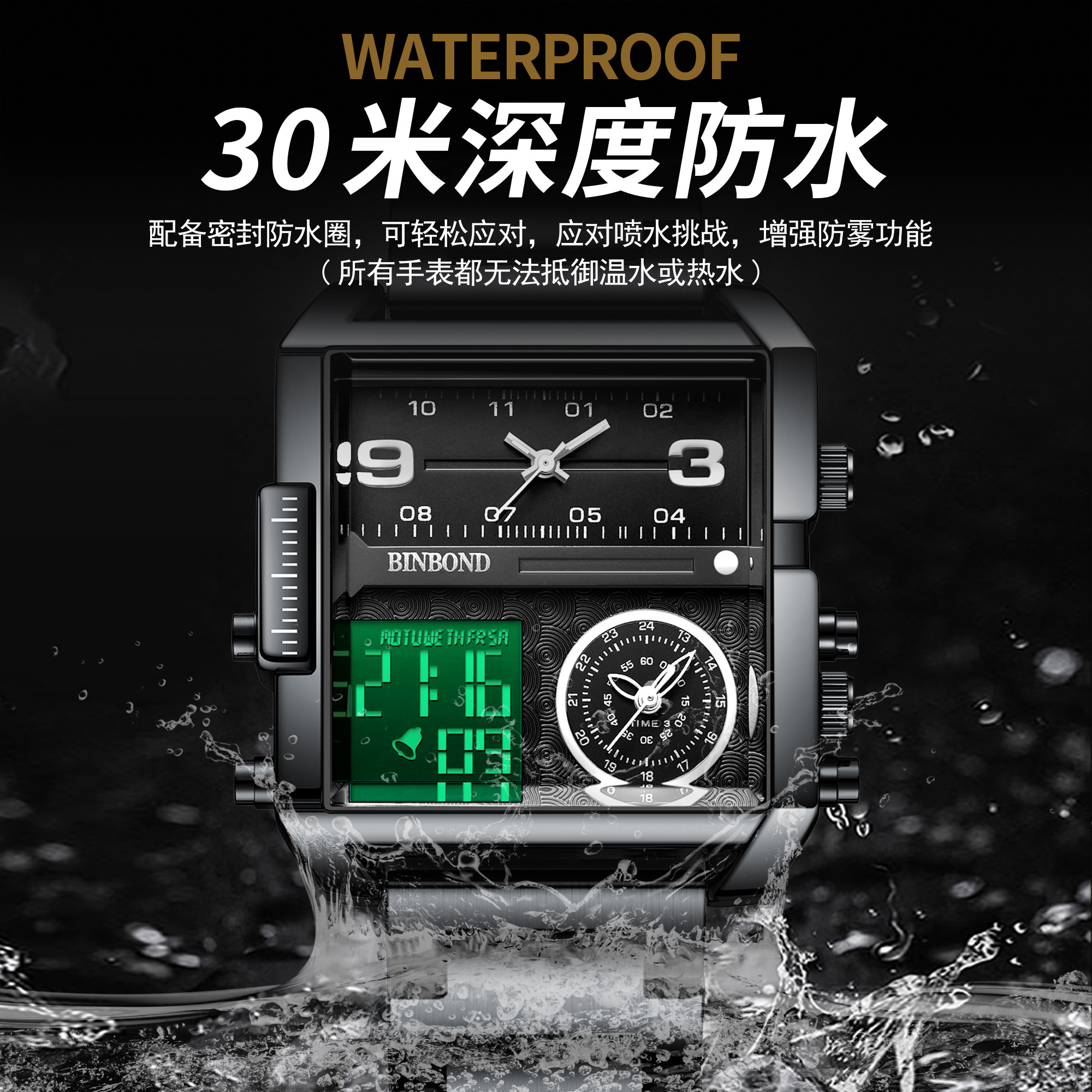 BINBOND男士电子表防水时尚商务多功能夜光日历男款夜光石英手表