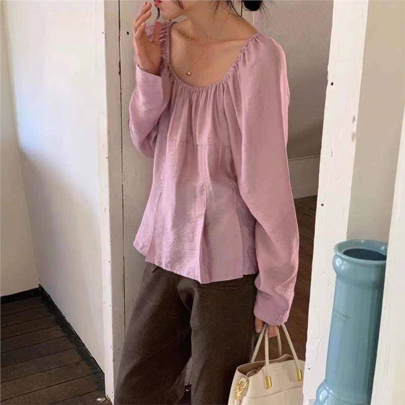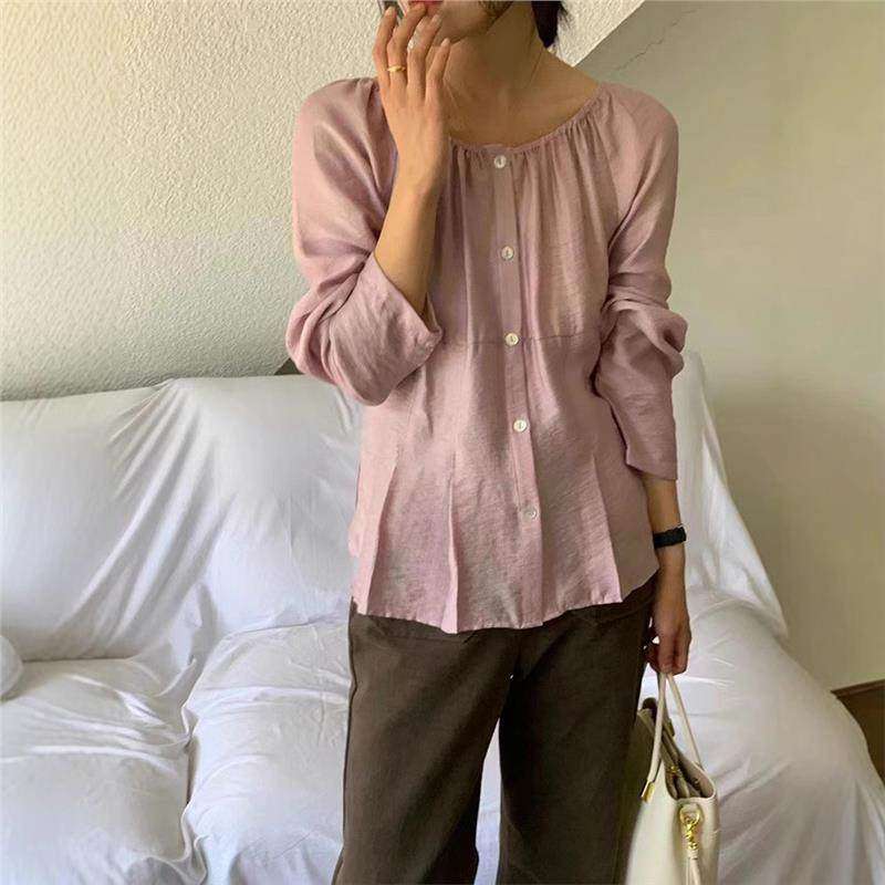 现货 one mo*e松紧领纯色单排扣打褶衬衫女高级感防晒衬衫2024秋