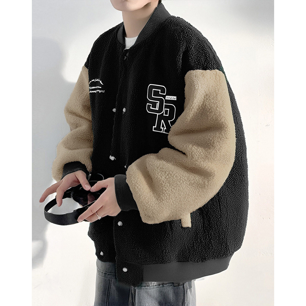 唐狮撞色拼接宽松仿羊羔毛外套男