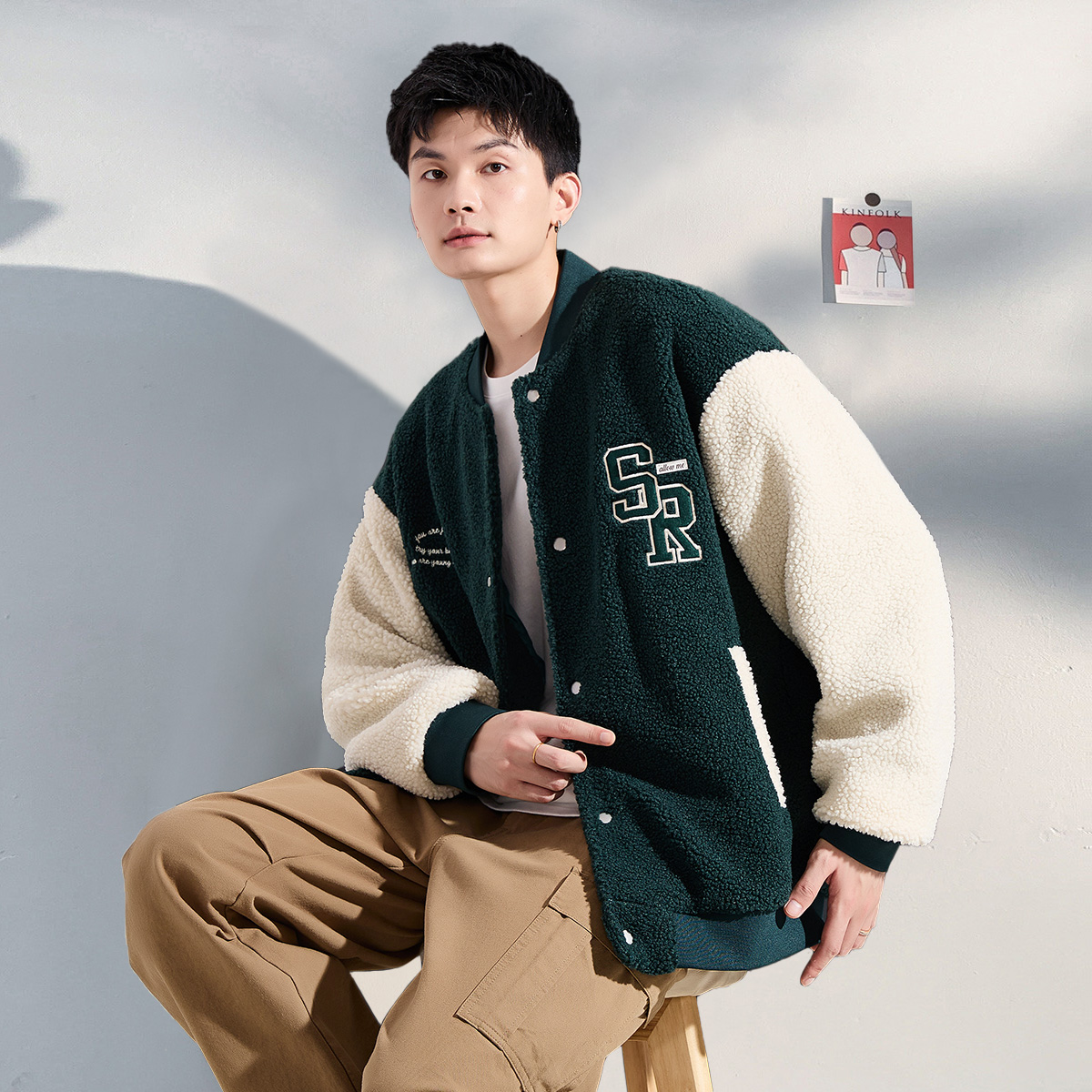 唐狮仿羊羔毛外套男款2025冬季新款美式棒球服宽松青少年加厚夹克