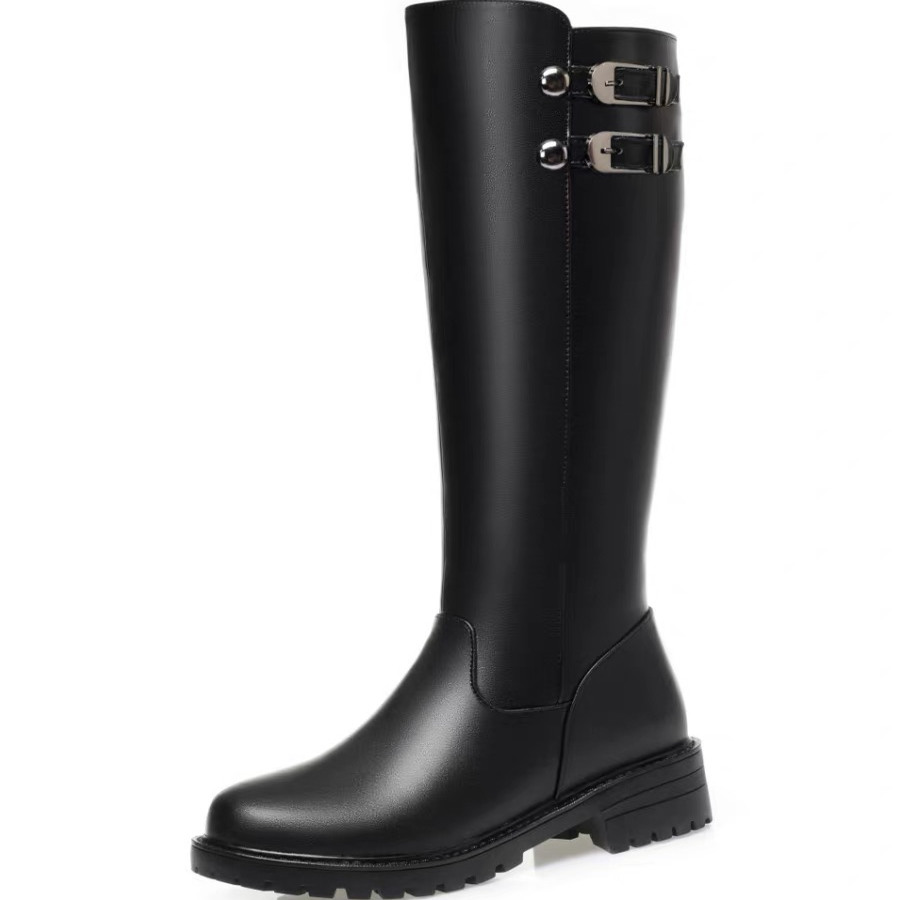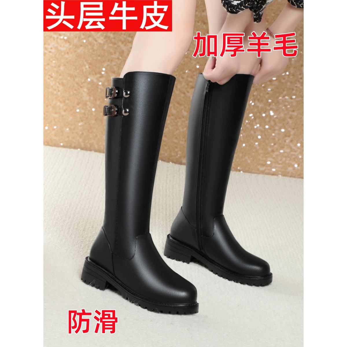 冬季真皮女靴平底棉靴防滑矮跟加绒羊毛长靴中筒高筒马靴子女棉鞋