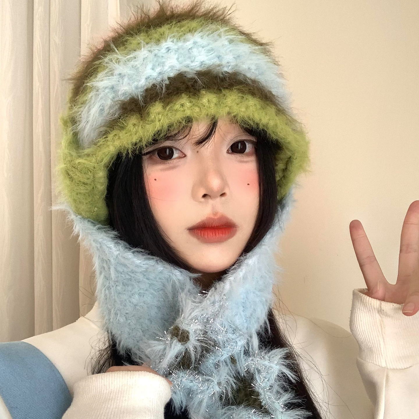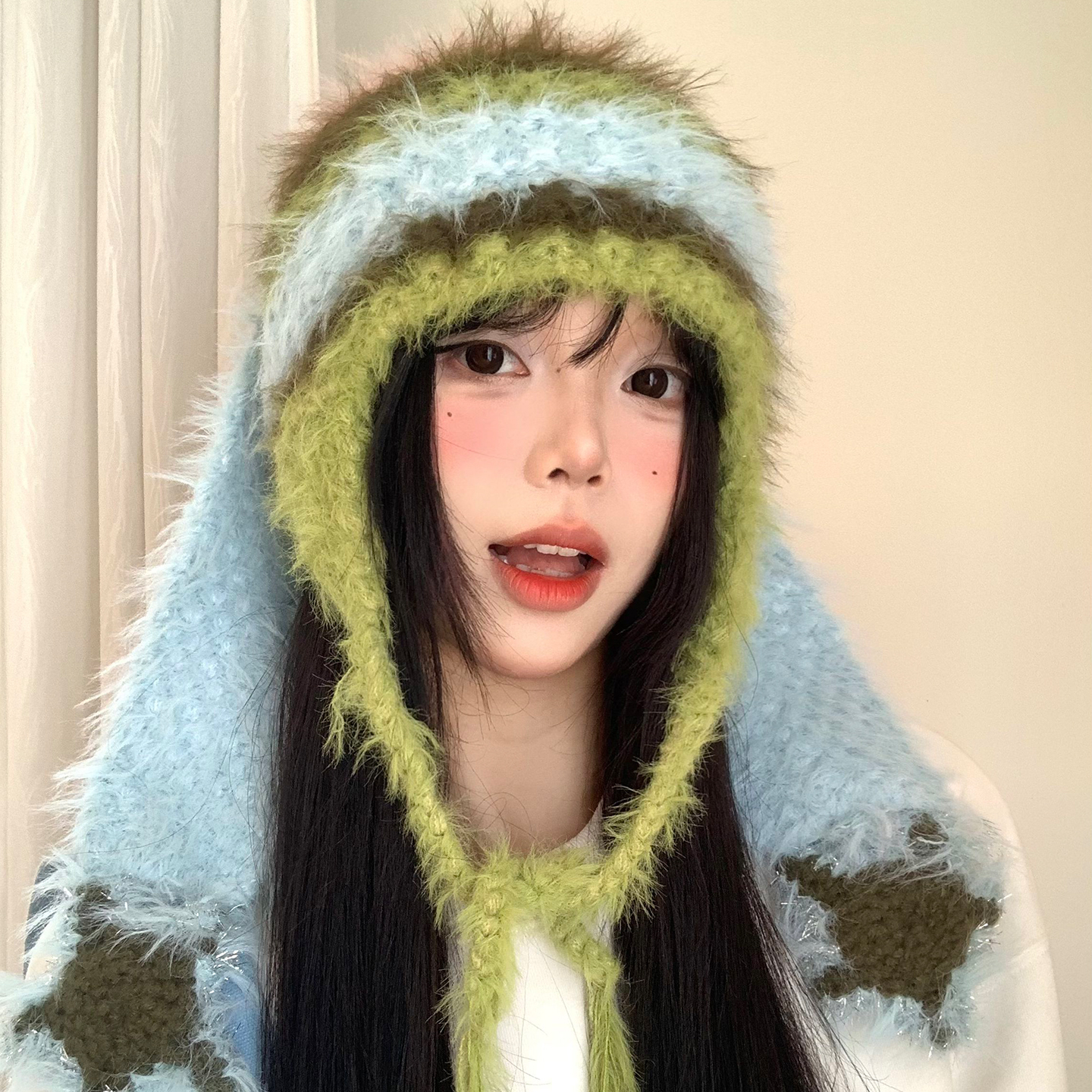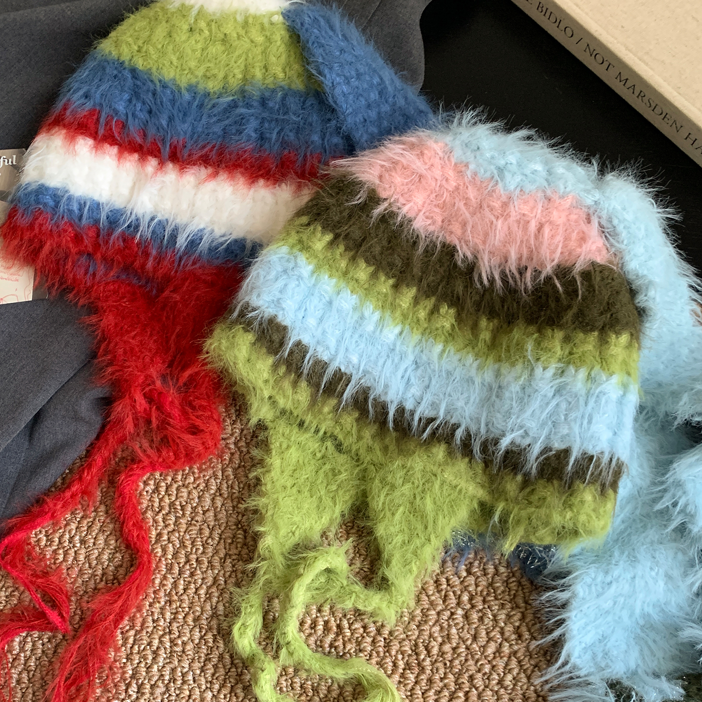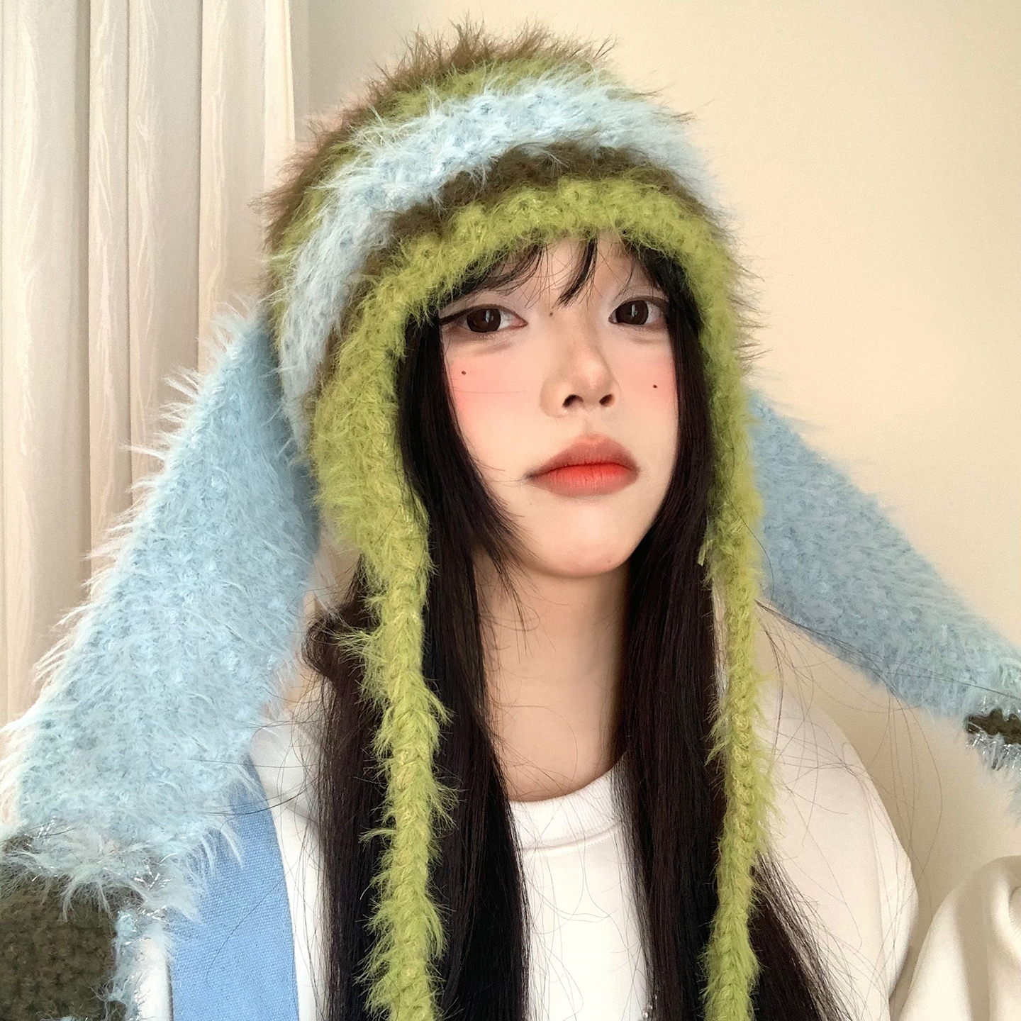 彩色条纹毛绒针织兔耳朵帽子女秋冬季可爱显脸小保暖护耳毛线帽子