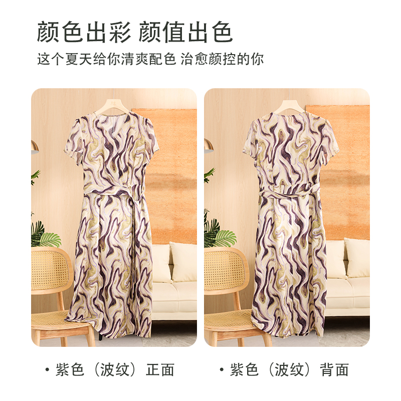 中年妈妈夏装洋气花色连衣裙收腰系带中老年女装气质时尚印花裙子