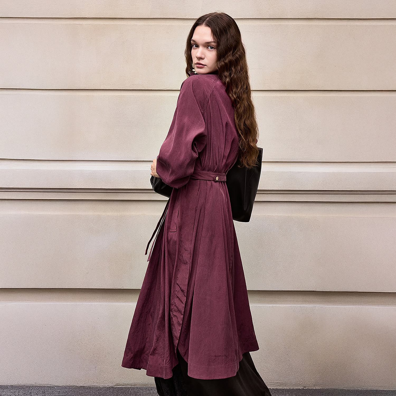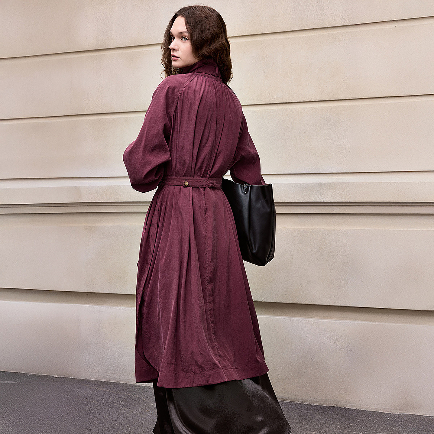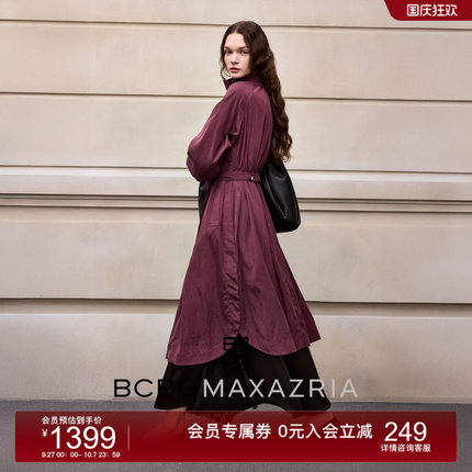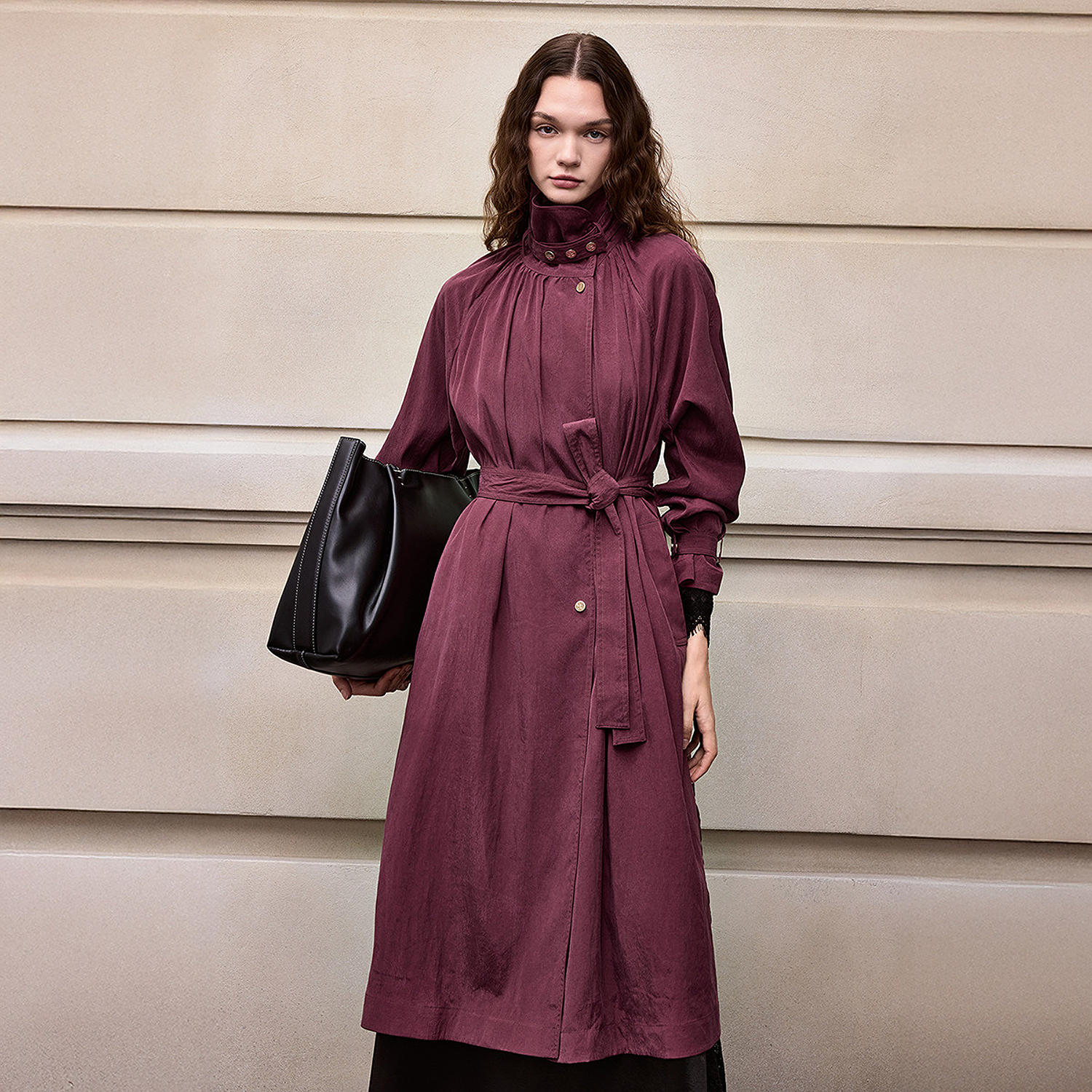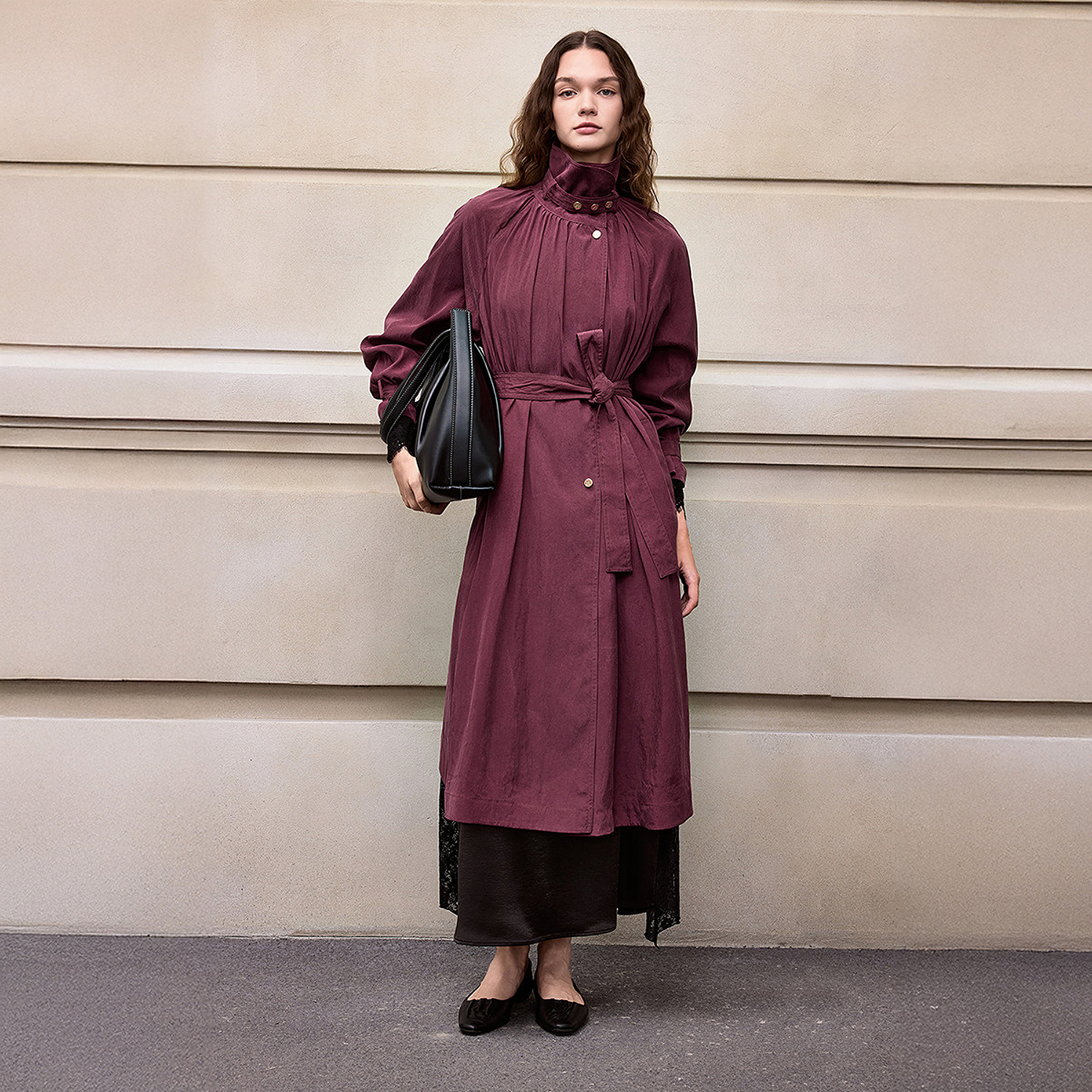 BCBG25早秋新款时尚流行褶饰立领插肩袖系带宽松长款女风衣外套