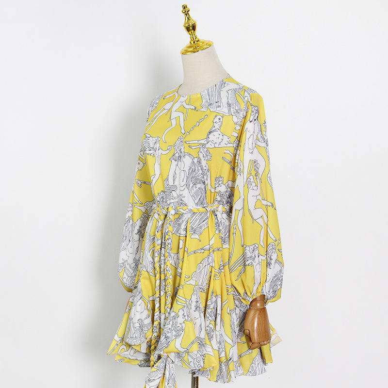 新款 时尚度假风系带A字裙2025圆领印花荷叶边短款连衣裙女