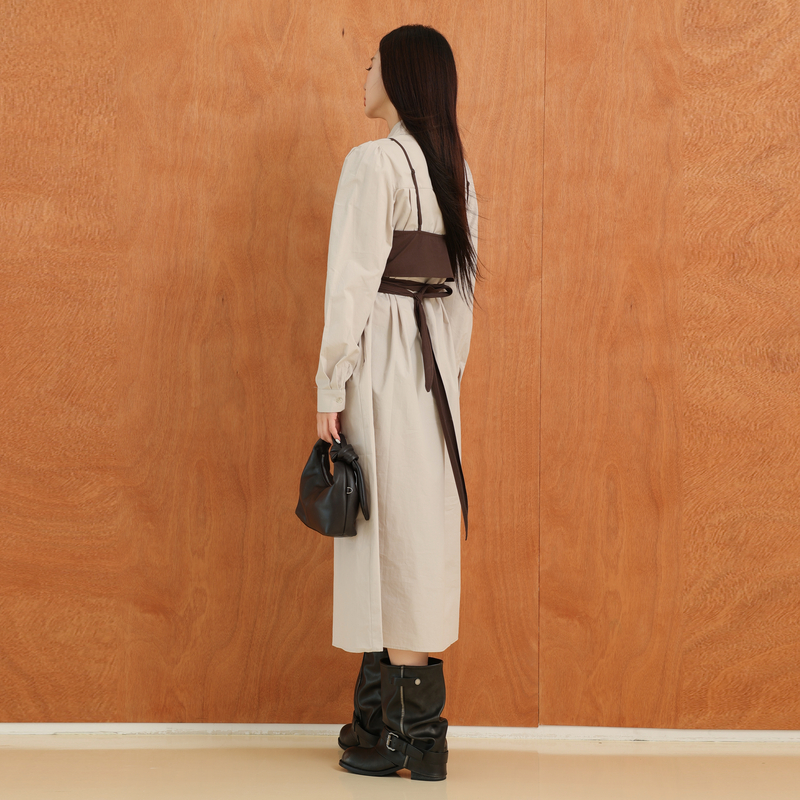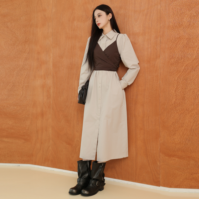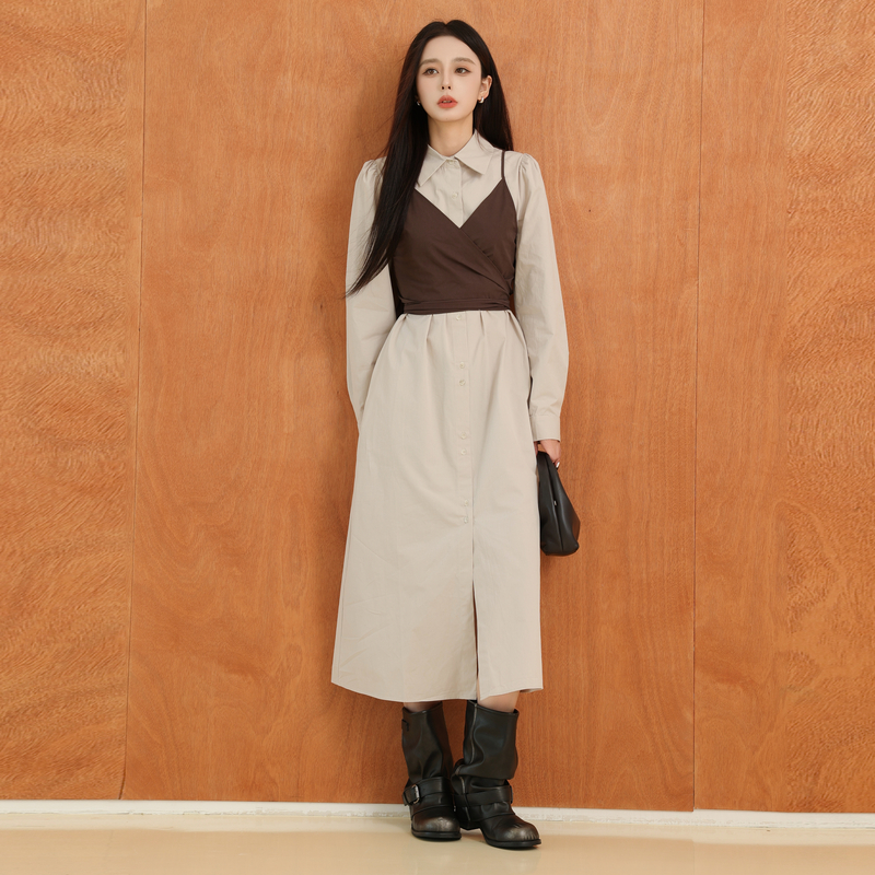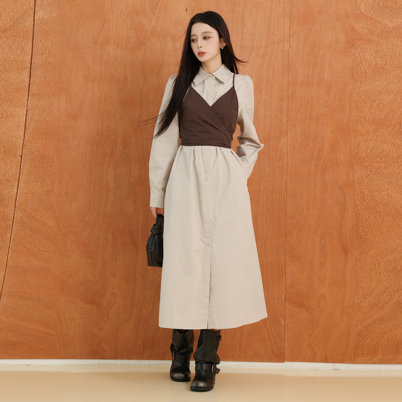 AIRIQI秋季新款法式复古收腰衬衫连衣裙+吊带背心套装女AH44TZ498