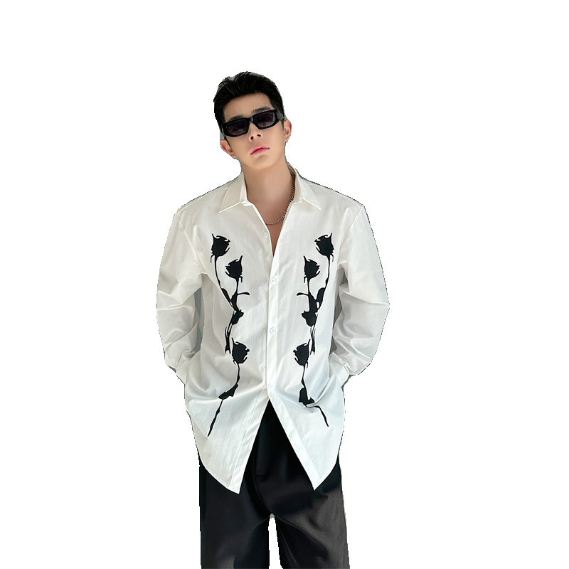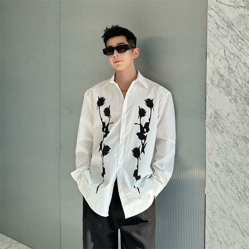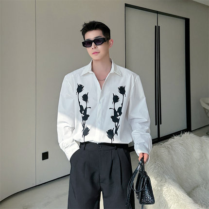 春夏复古黑玫瑰印花设计感长袖衬衫男韩版休闲高级感白色垂感衬衣