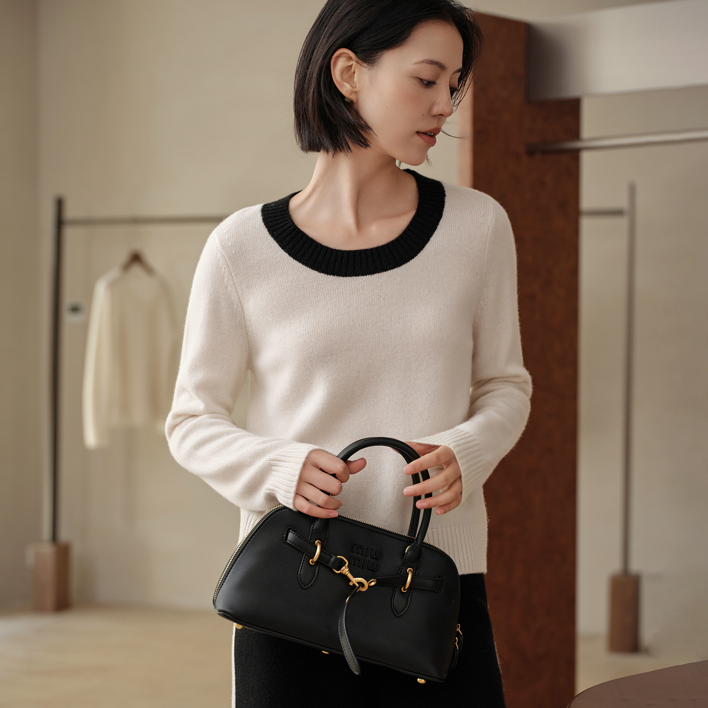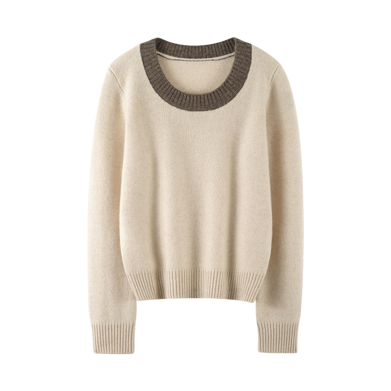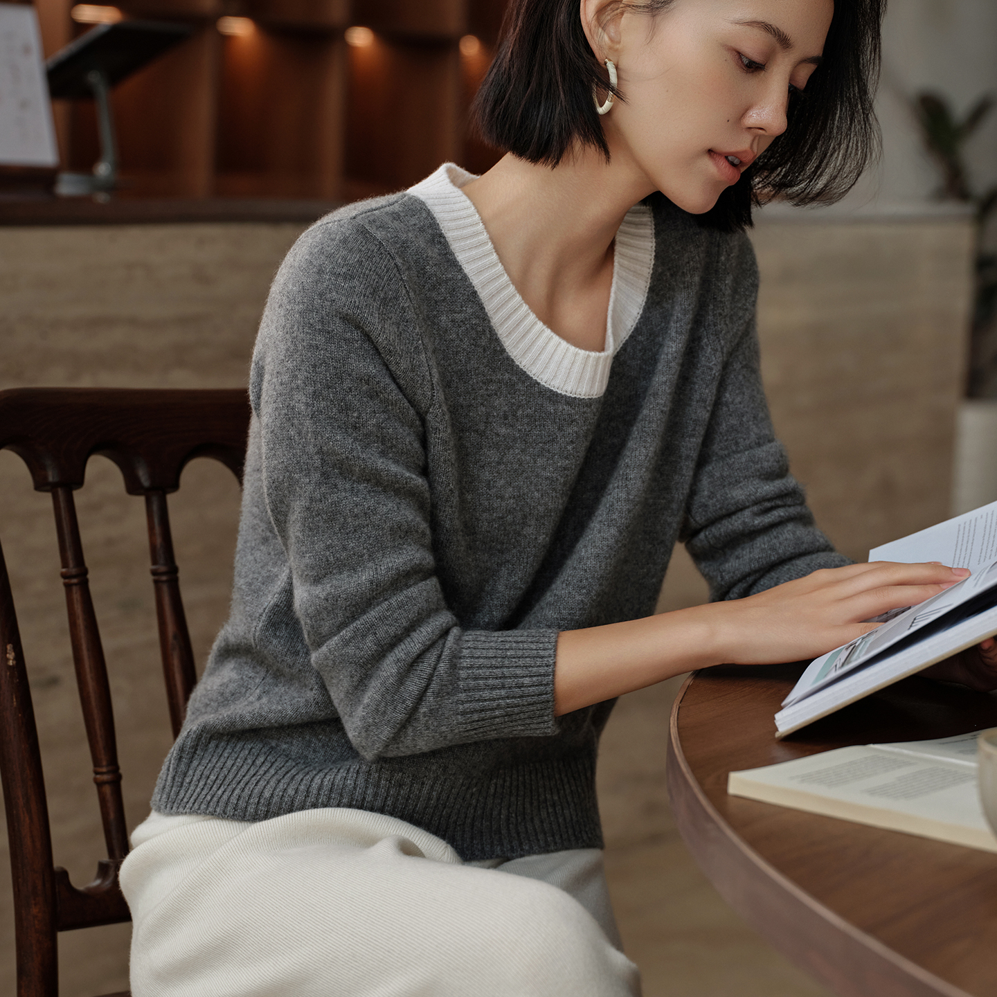 2025秋冬新款100%纯山羊绒衫女圆领撞色宽松加厚休闲针织衫毛衣潮