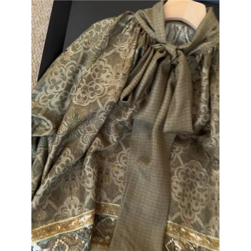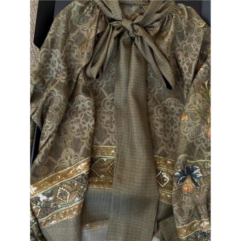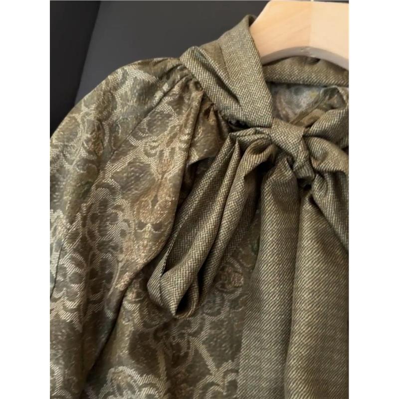 高端小资法式上衣新款今年绿色印花系带衬衫女高级感轻奢减龄洋气
