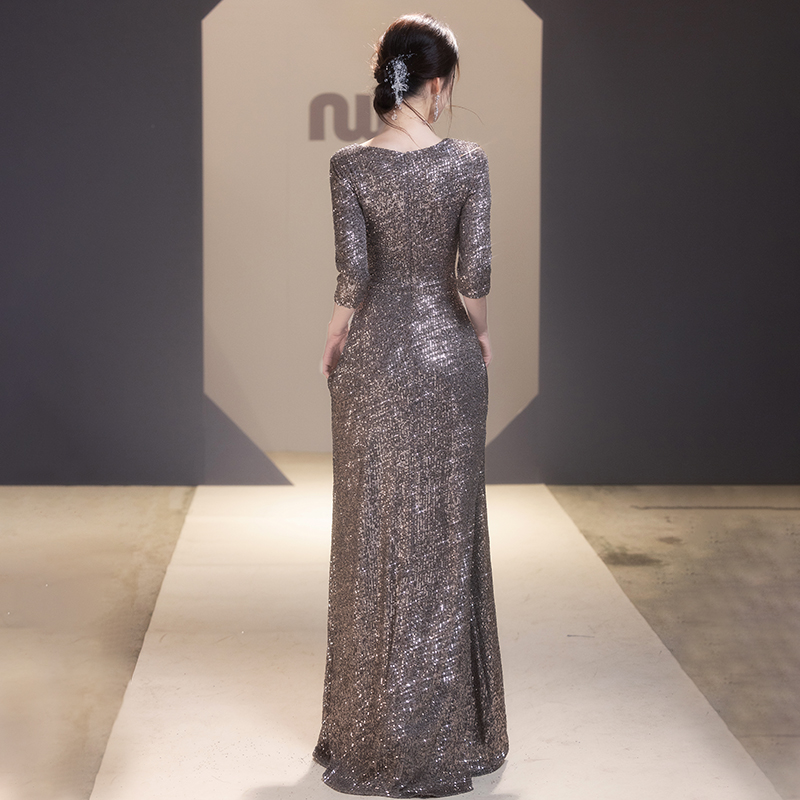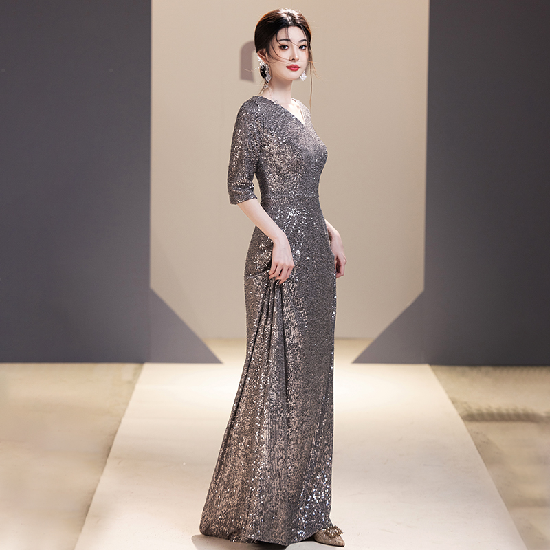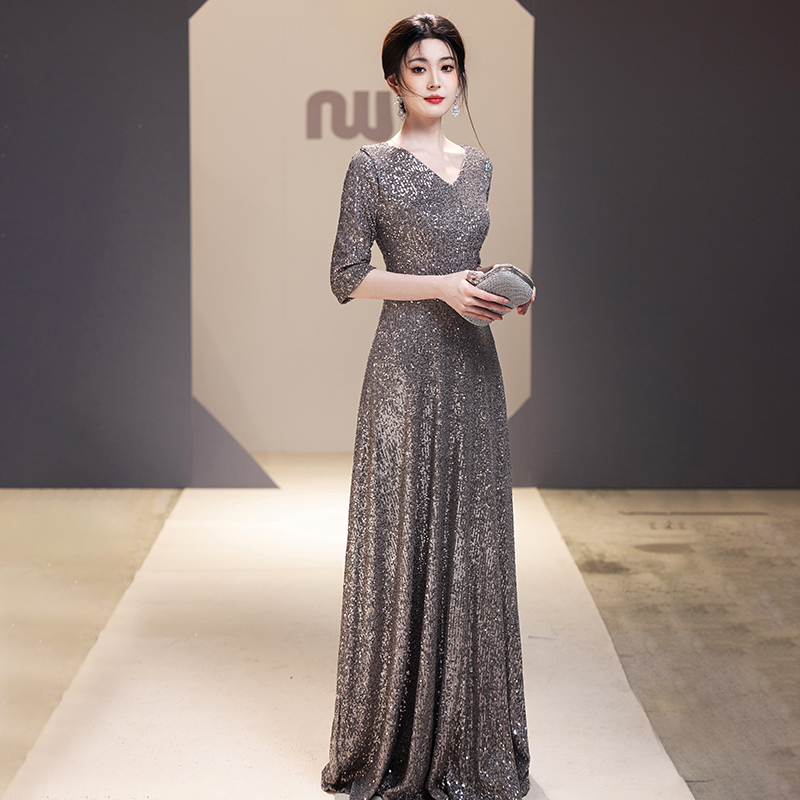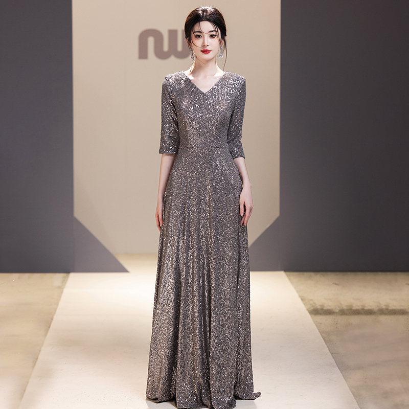 大合唱团演出服V领长袖晚礼服女宴会高端轻奢钢琴演奏指挥服长裙