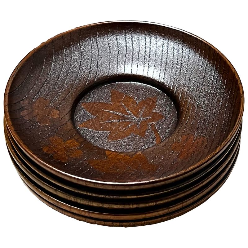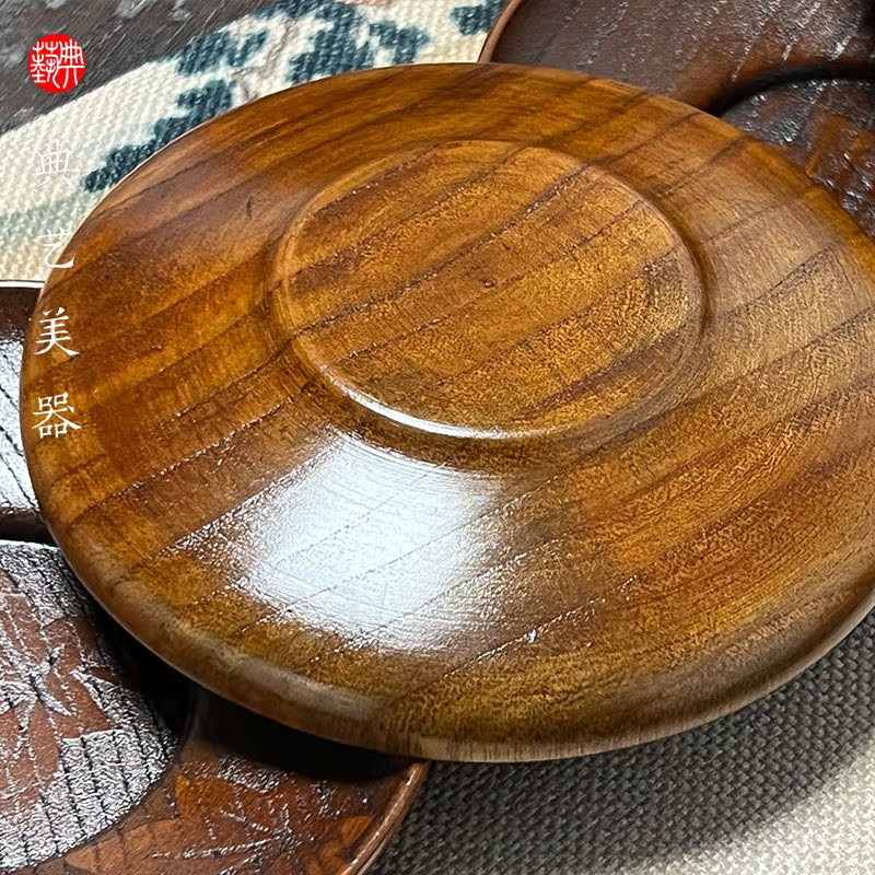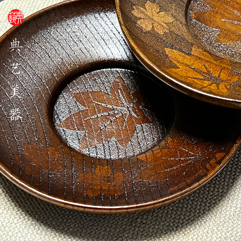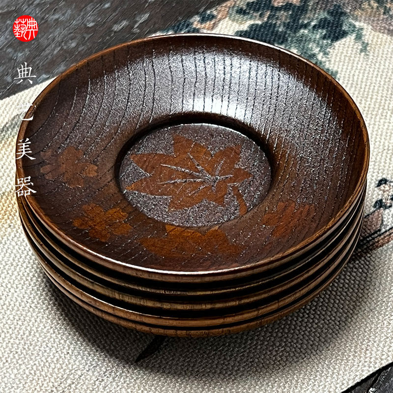 日本大漆实木一木挖浅浮雕枫叶日式圆形茶托手工雕刻