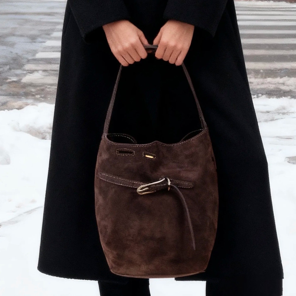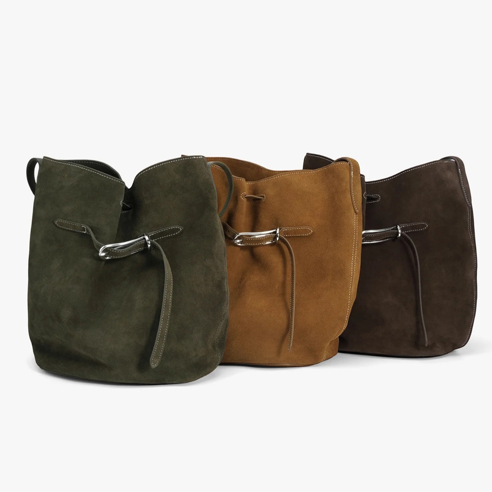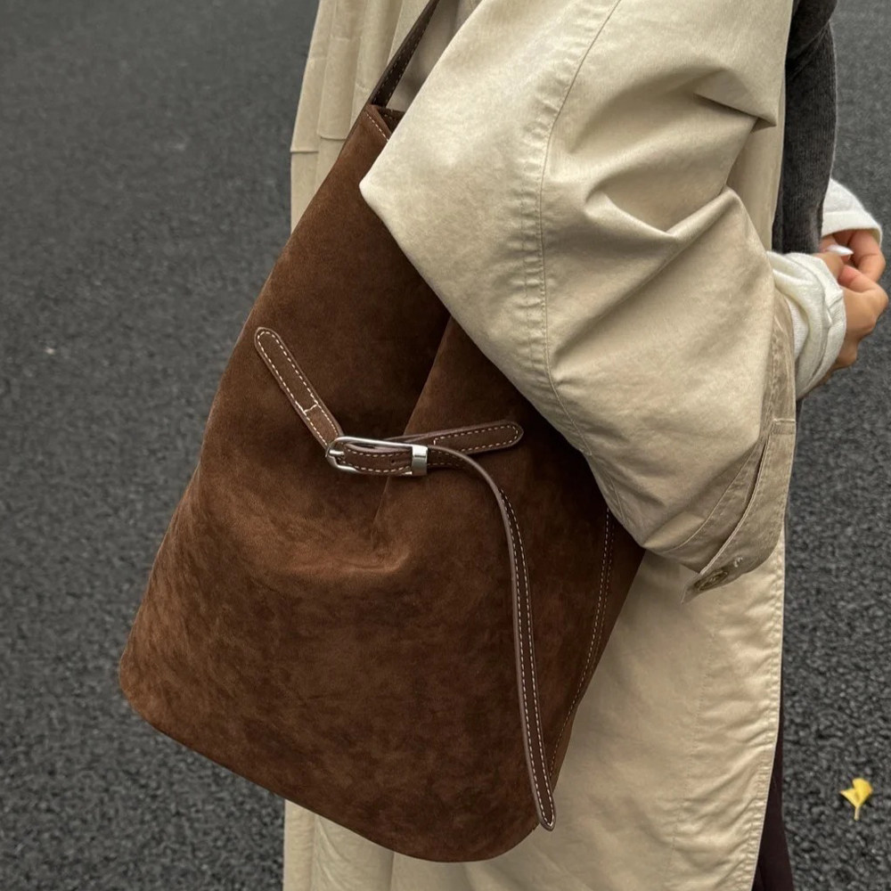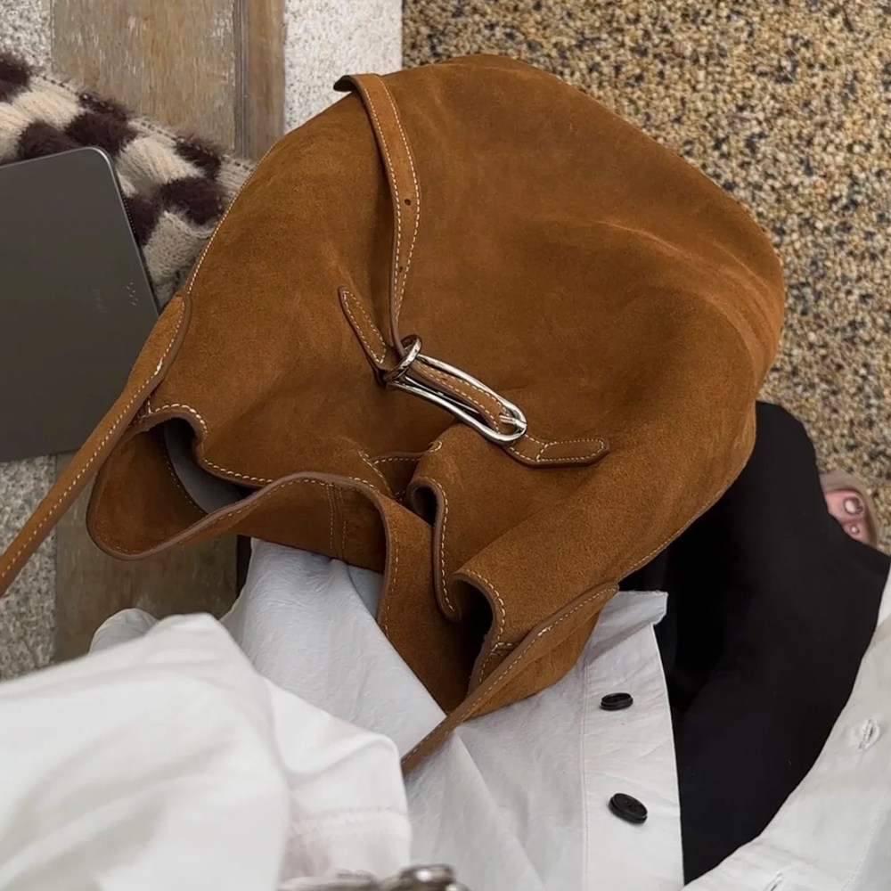 欧洲站小众麂皮绒头层牛皮真皮女包单肩腋下大容量水桶包托特大包