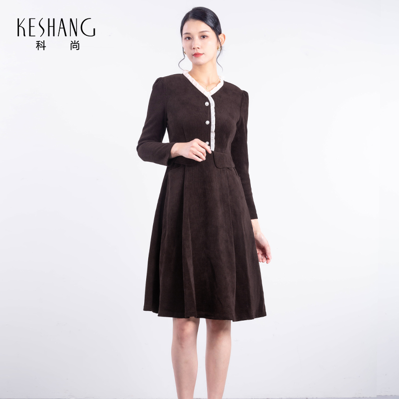 科尚中长款连衣裙女2024秋季新款坑条纹裙子花边领收腰显瘦长裙