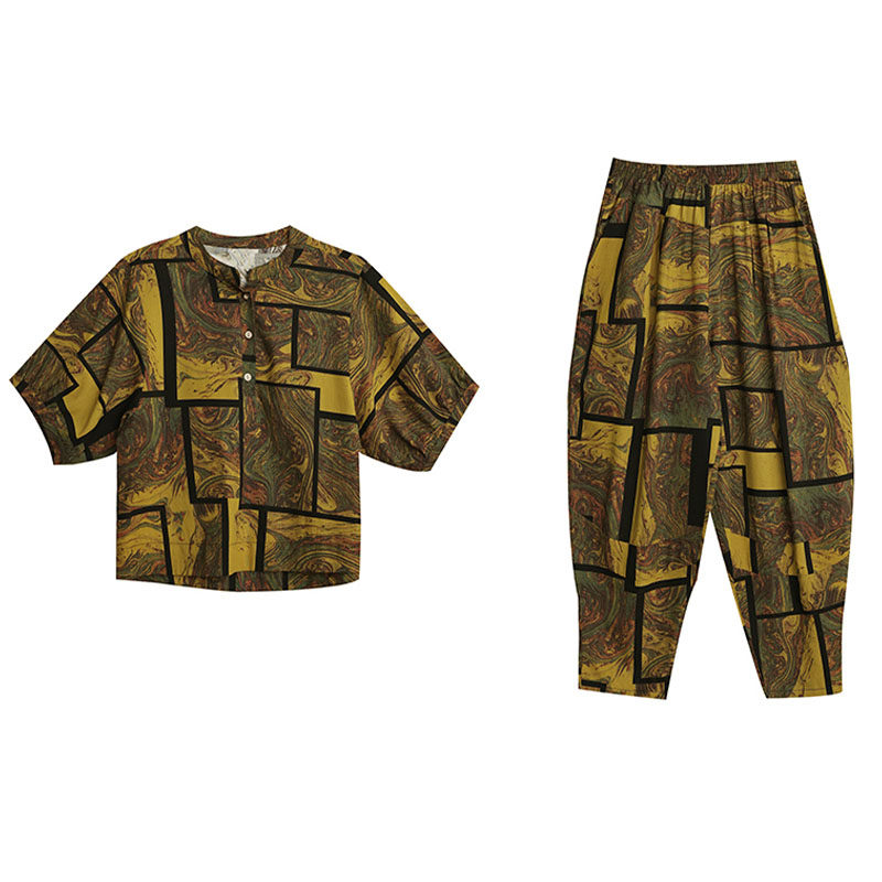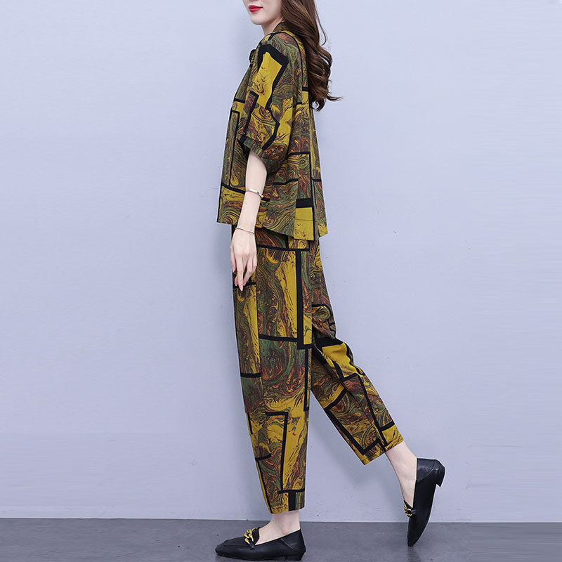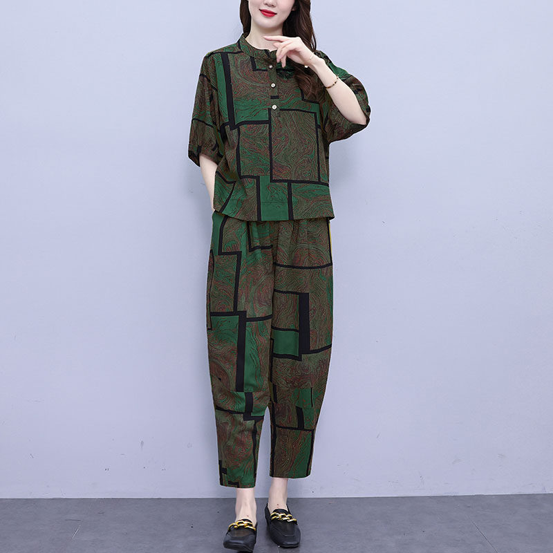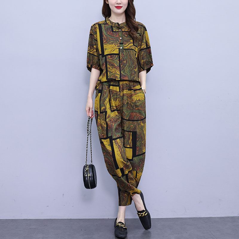 中老年妈妈洋气时尚套装女2025夏装短袖休闲哈伦裤显瘦大码两件套