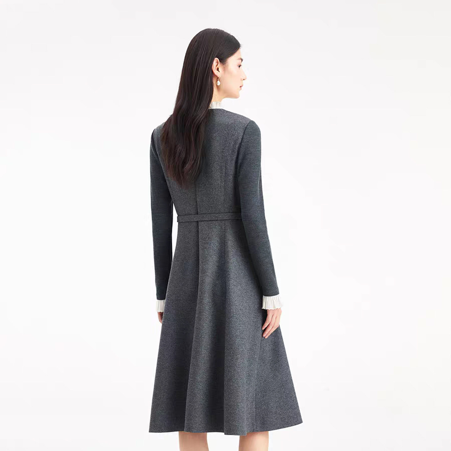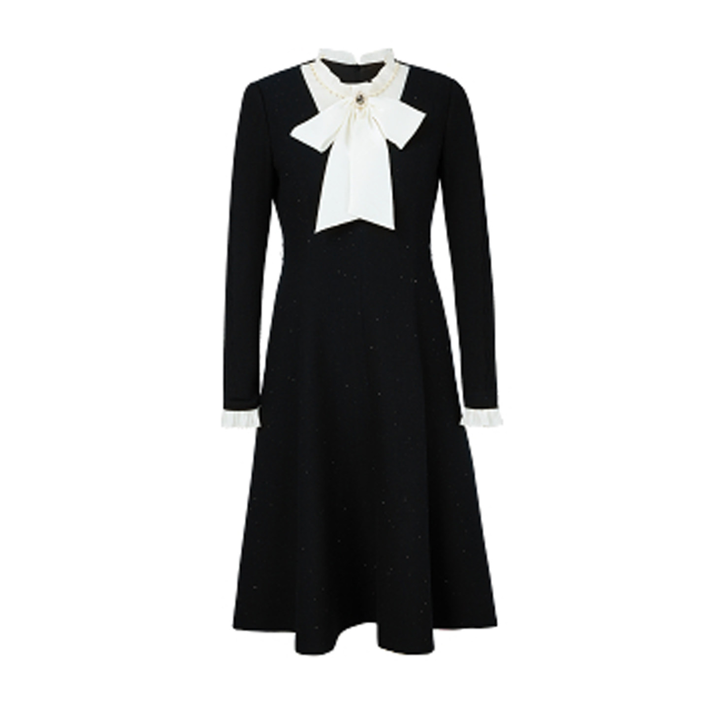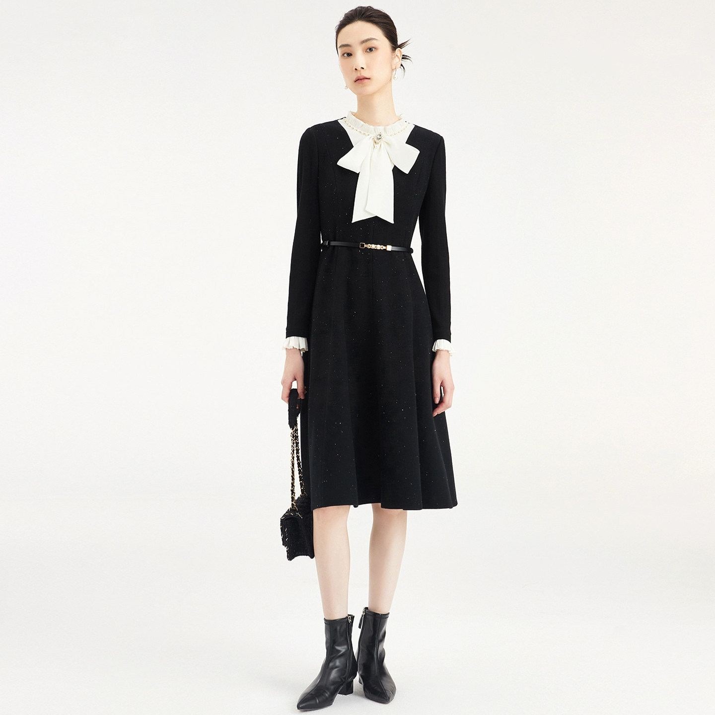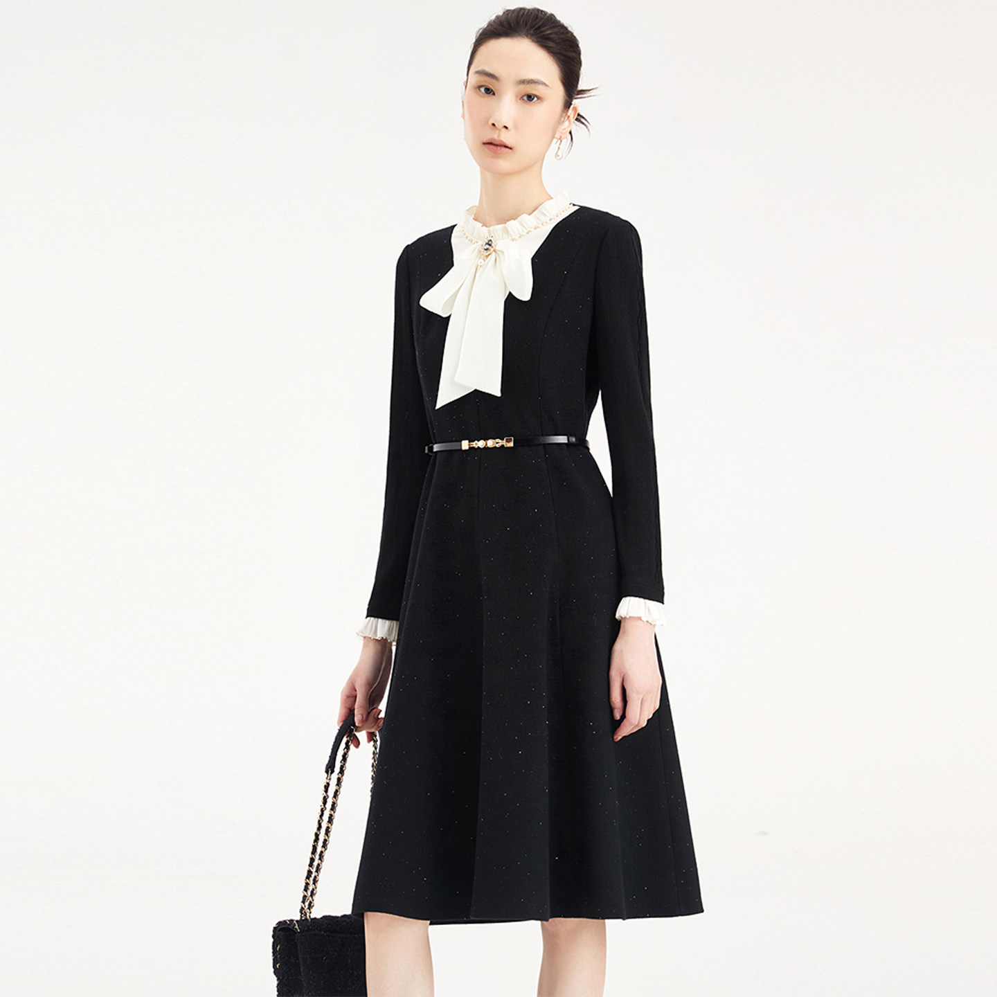 珂莱商场同款2025秋冬季新款拼接飘带领中长款羊毛呢连衣裙子女装