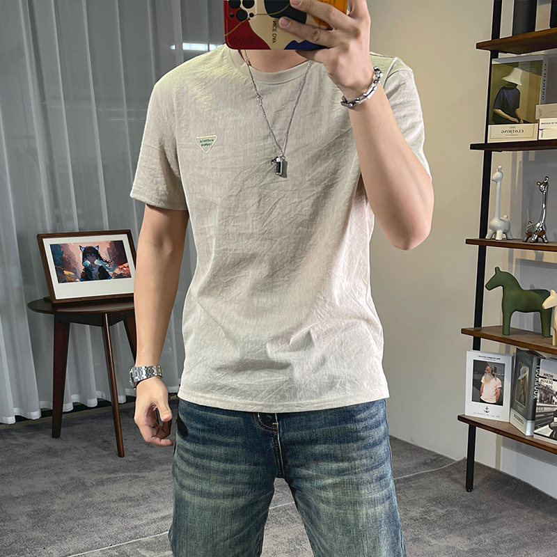 冰丝棉麻短袖t恤男轻奢三角标体恤衫青年圆领亚麻休闲麻料潮上衣