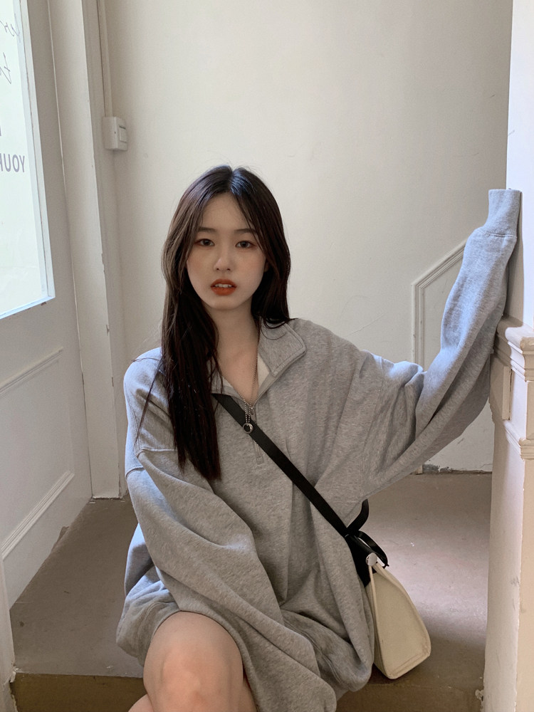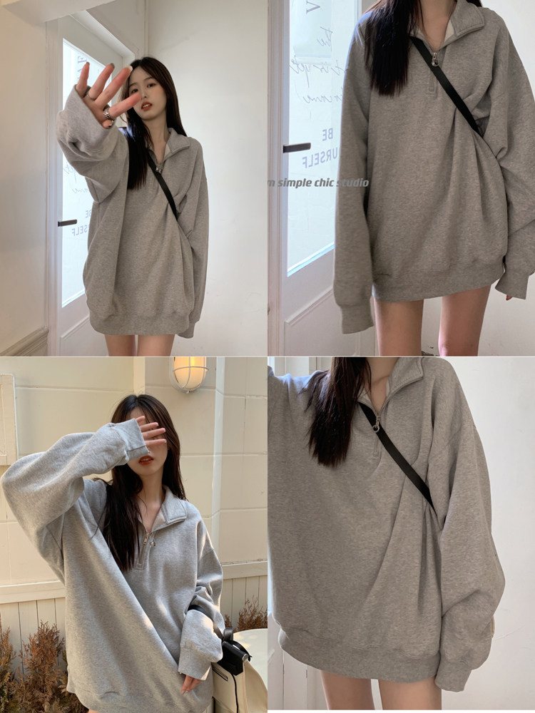 灰色翻领早秋美式宽松慵懒卫衣